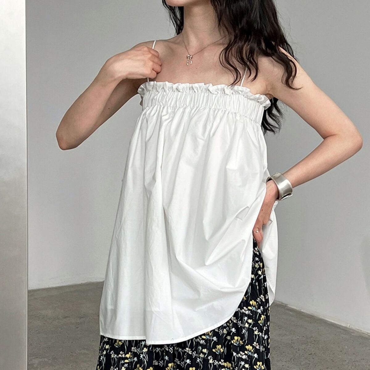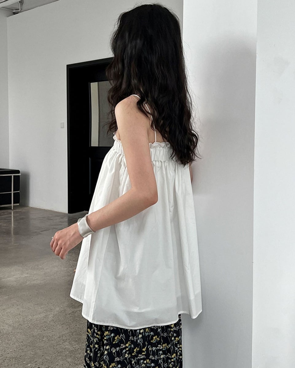 レディライクなギャザーデザインで一枚でも様になるベアトップ。