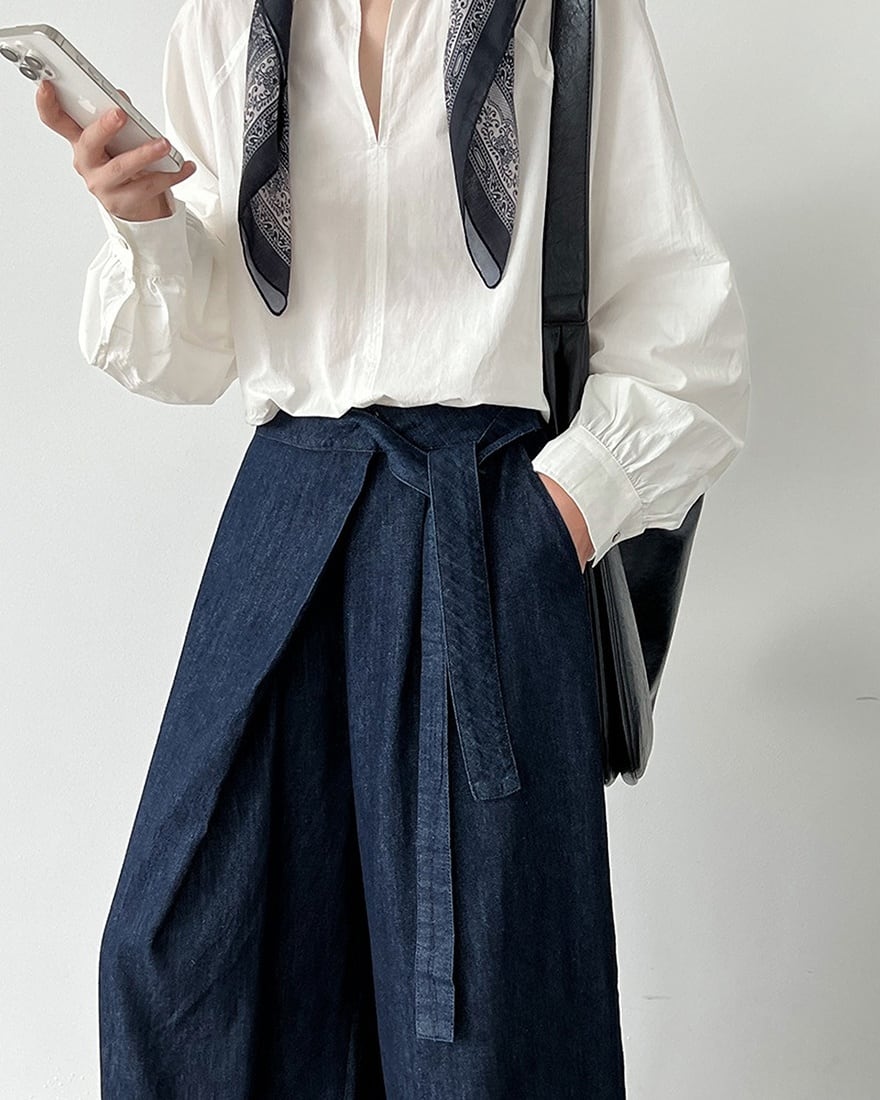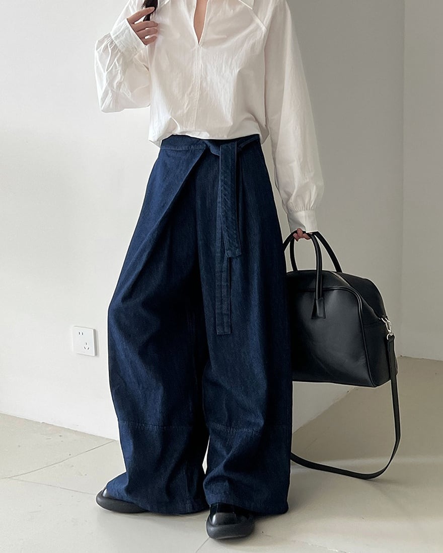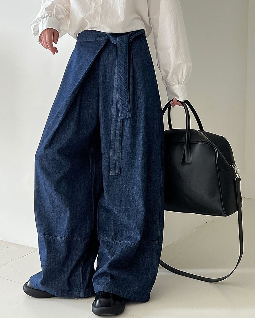 濃いインディゴブルーが上品な印象のワイドパンツ。ウエストのベルトデザインが視線を集め、コーデのポイントに。カジュアルすぎず、大人っぽく仕上がるので、デイリーにもお出かけにも活躍します。