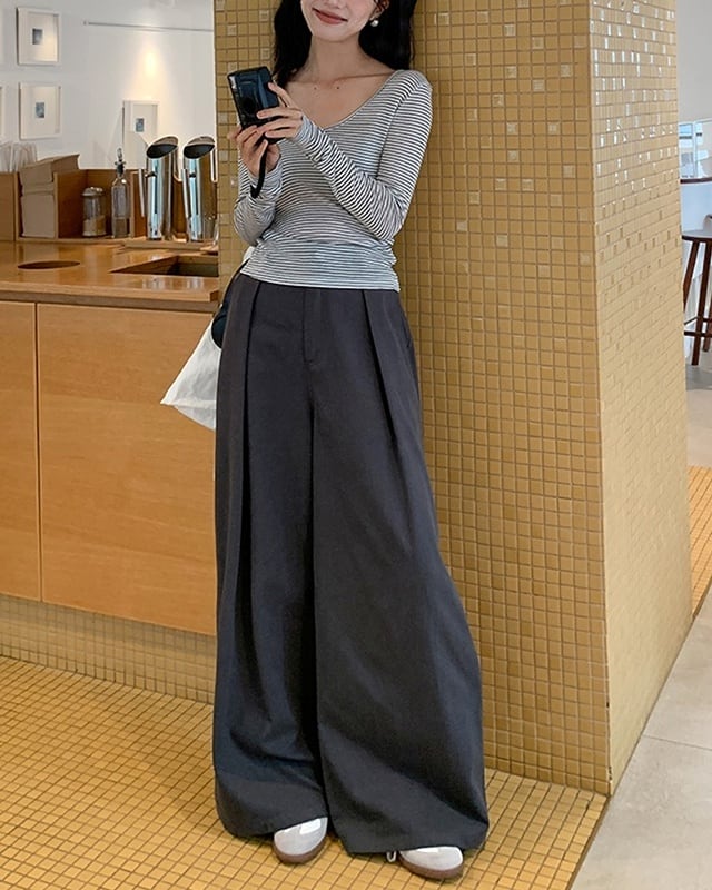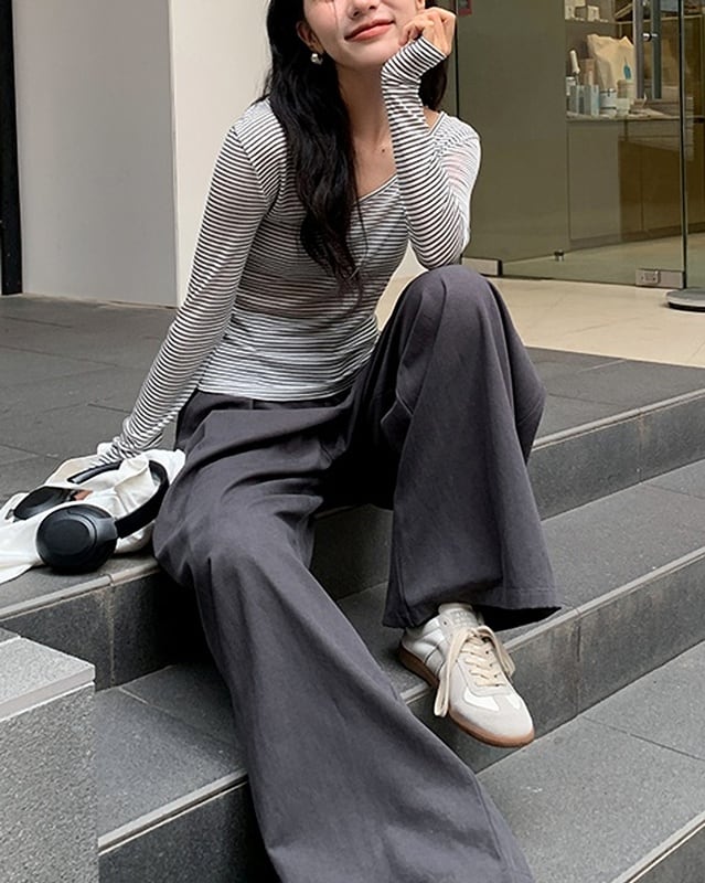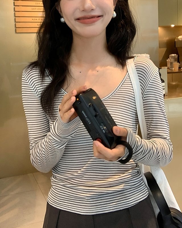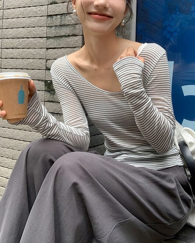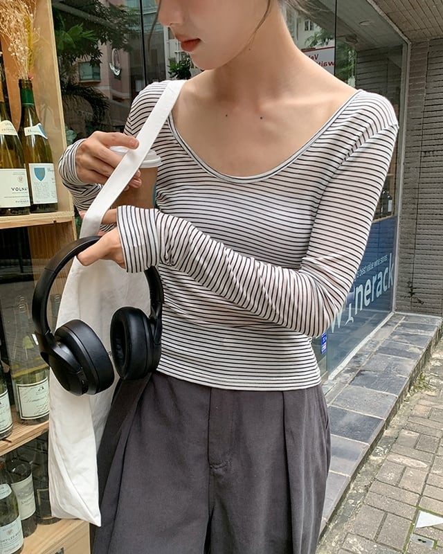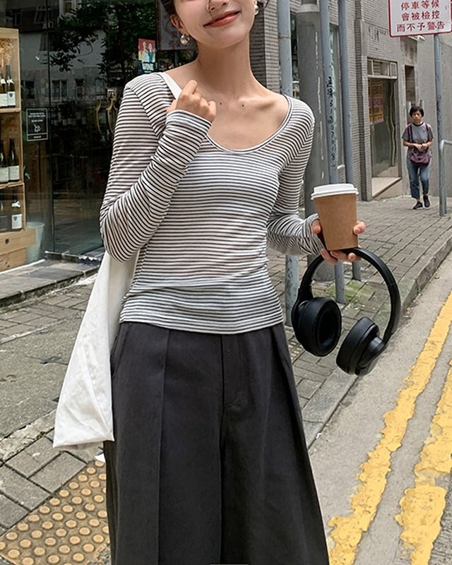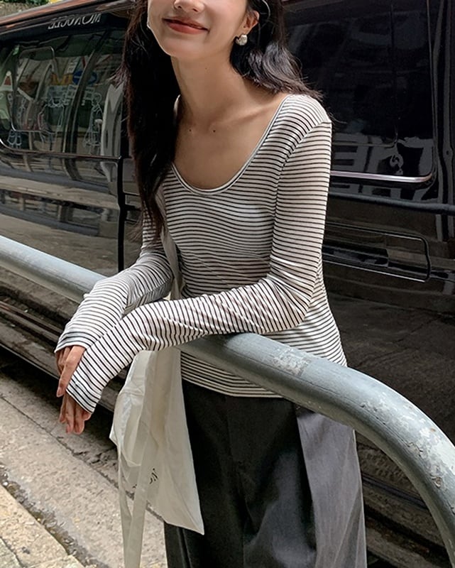 定番のボーダーを細ピッチで大人っぽく仕上げた長袖カットソー。大きく開いたラウンドネックがデコルテを美しく見せ、カジュアルと女性らしさを両立した一枚です。