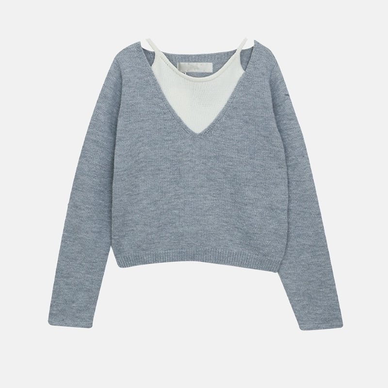 レイヤードスタイルをスマートに楽しめるニットトップス。ホワイトとグレーのバイカラーが清潔感を与え、インナーのアメリカンスリーブVネックがさりげないアクセントに。1枚でスタイリングが完成する優秀アイテムです。