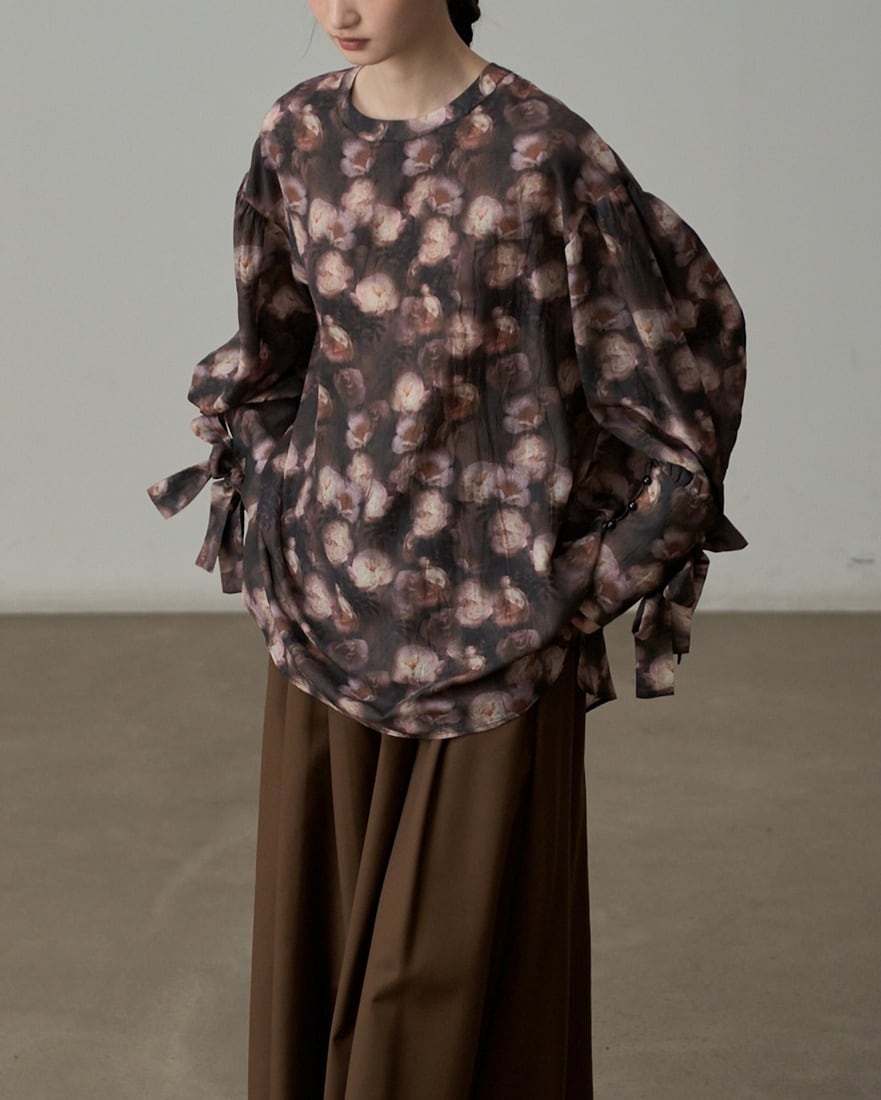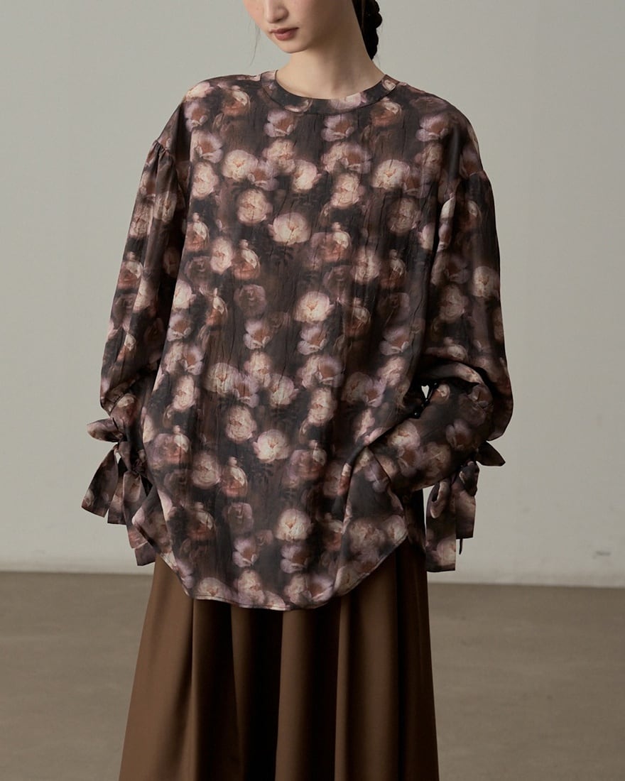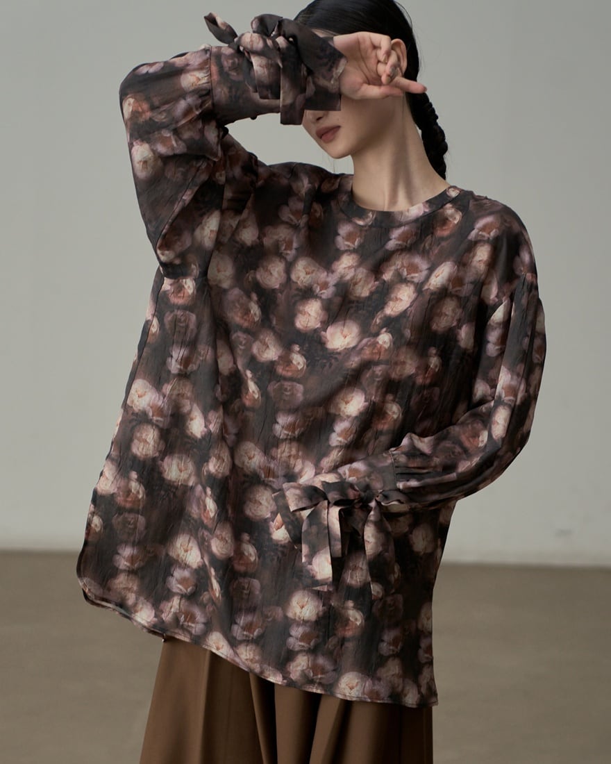 シックな黒地に淡くぼかしたピンクの花柄が広がるブラウス。リボンで結ぶ袖口がさりげなく華やかさをプラスし、大人の女性らしい柔らかな雰囲気を演出します。デイリーから特別な日まで幅広く活躍するデザインです。