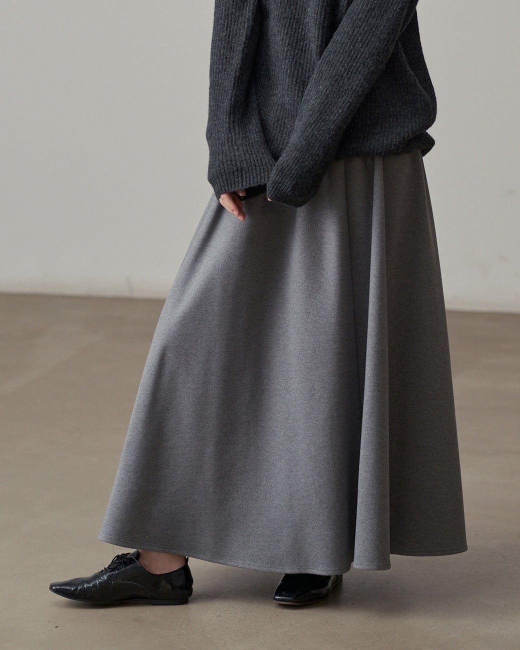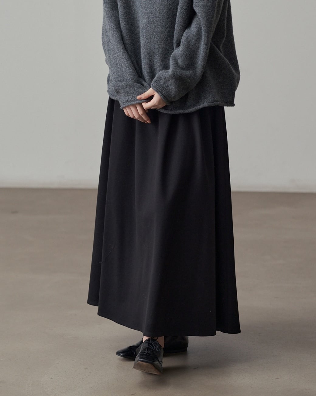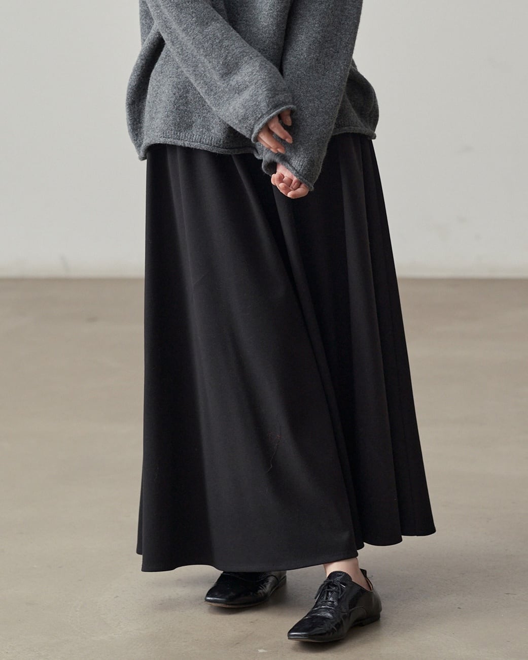 動くたびに美しいラインを描く、落ち感のあるロング丈ドレープスカート。ウエストはゴム仕様で、ストレスフリーな履き心地に。シンプルながら存在感のあるデザインで、カジュアルにもきれいめにも活躍する1枚です。