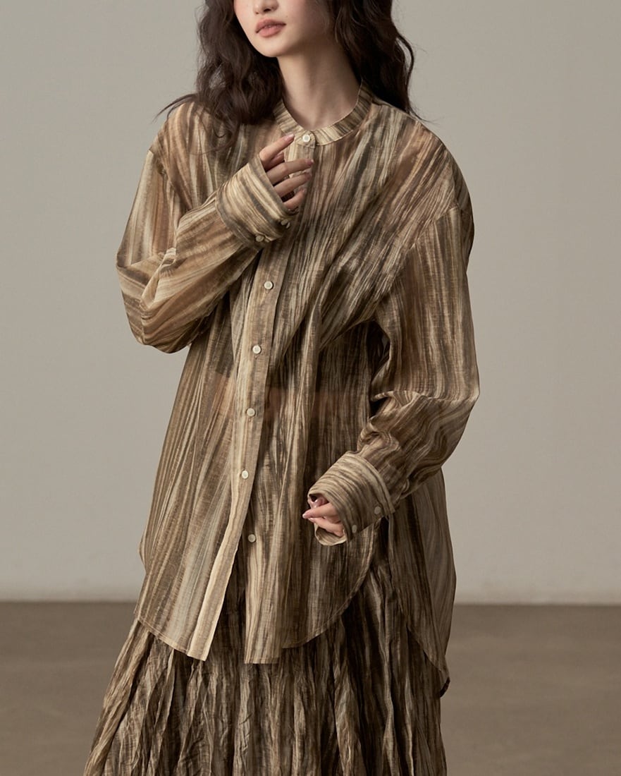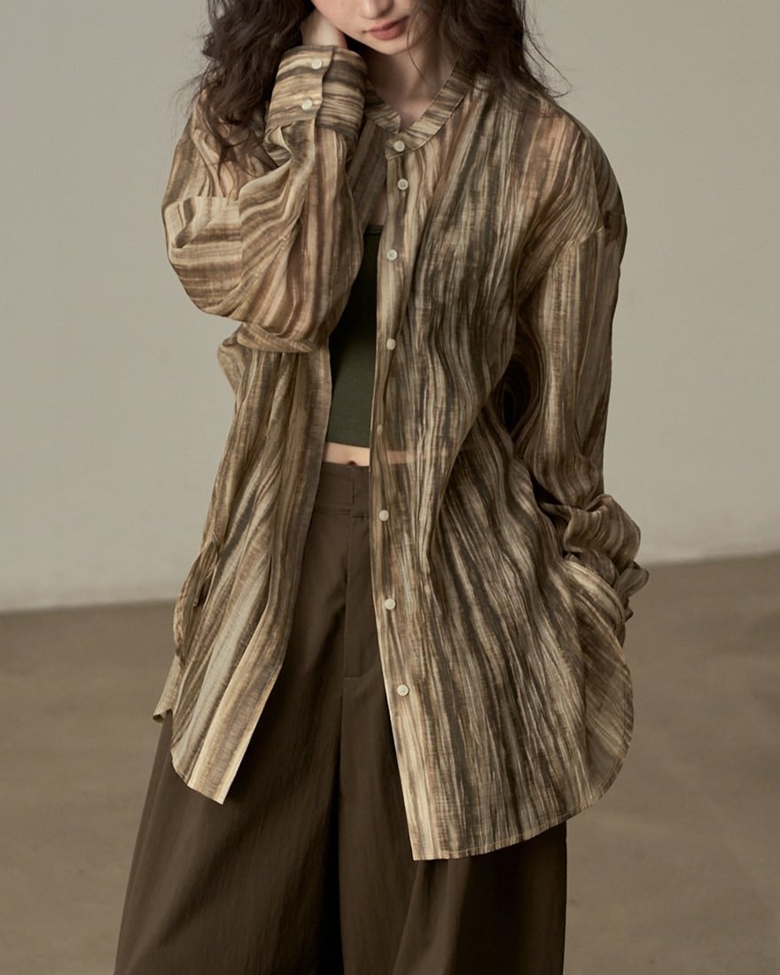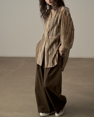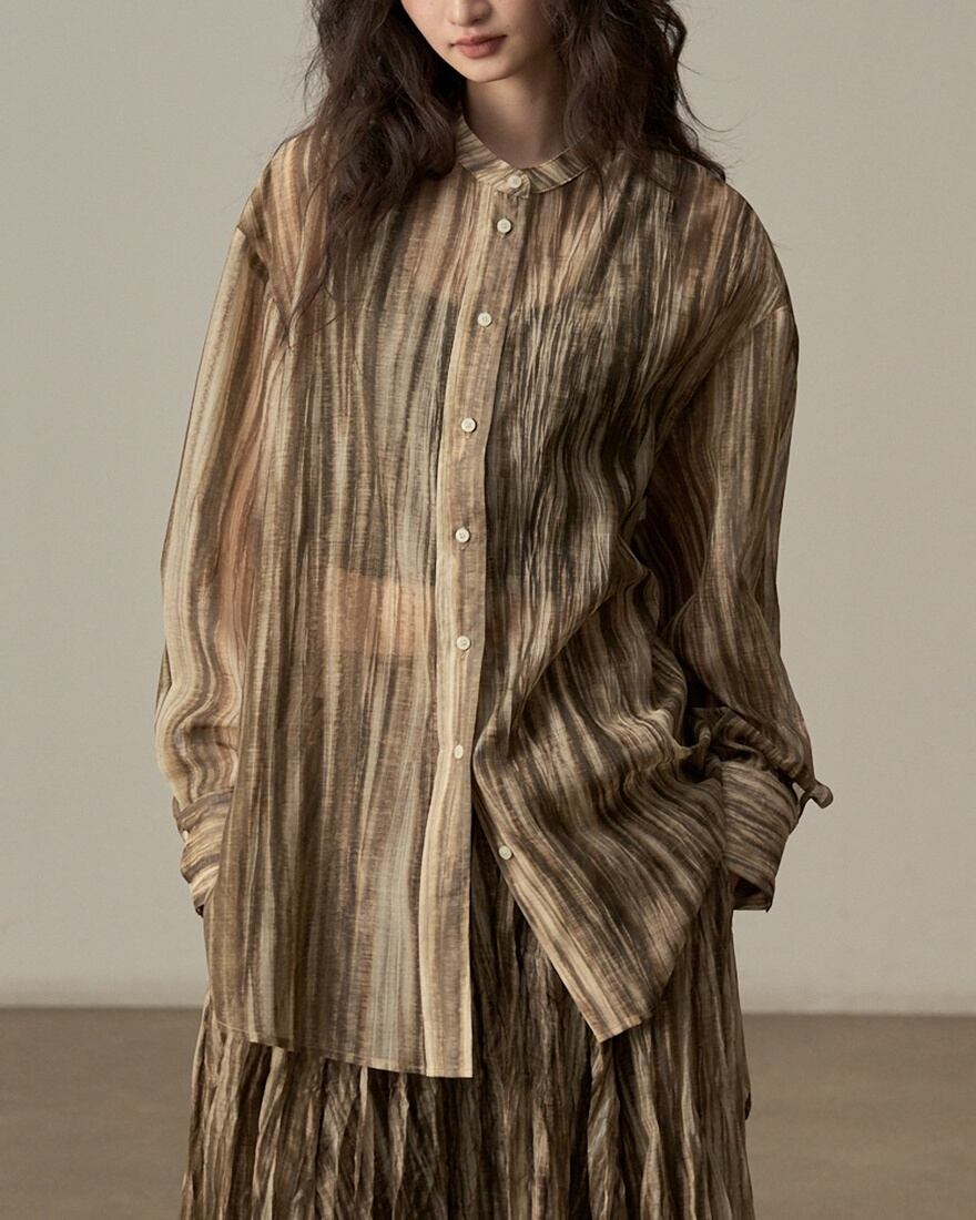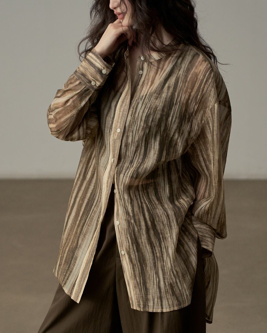 程よいシアー感が抜け感を演出する、ブラウンカラーの総柄シャツ。ニュアンスのあるデザインがさりげなくおしゃれ見えし、ゆったりとしたシルエットでリラックス感も◎。一枚で着映える主役アイテムです。