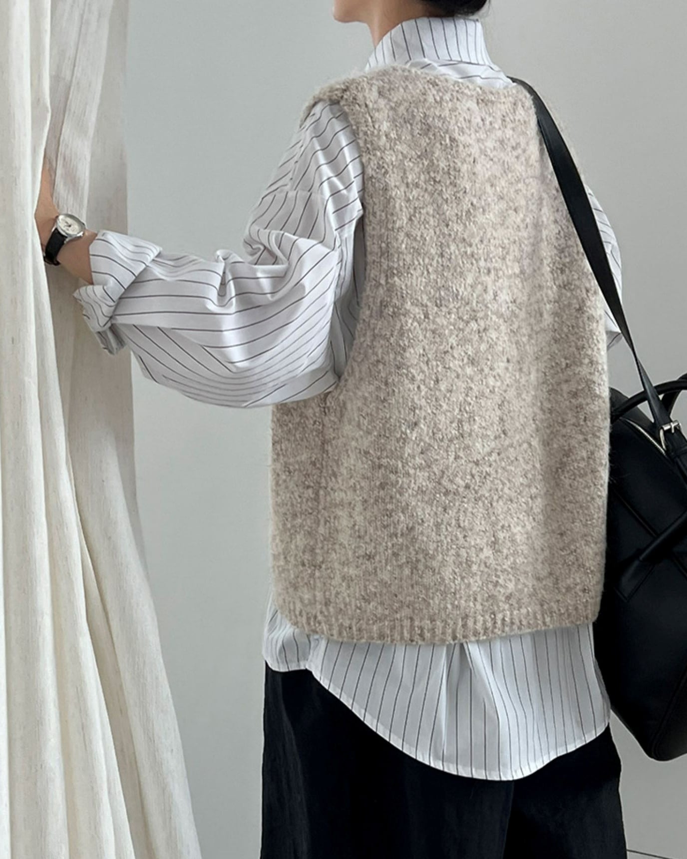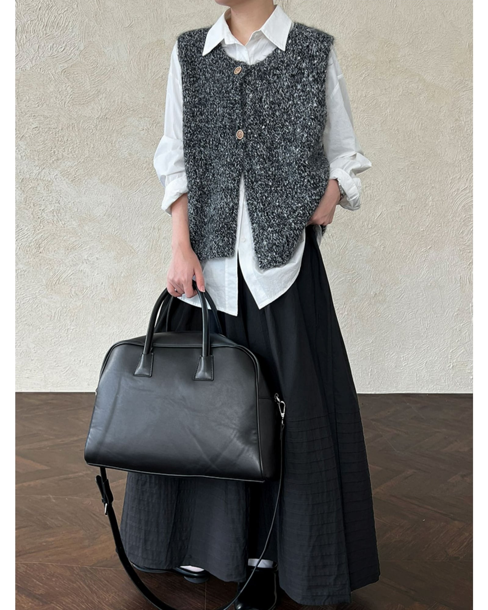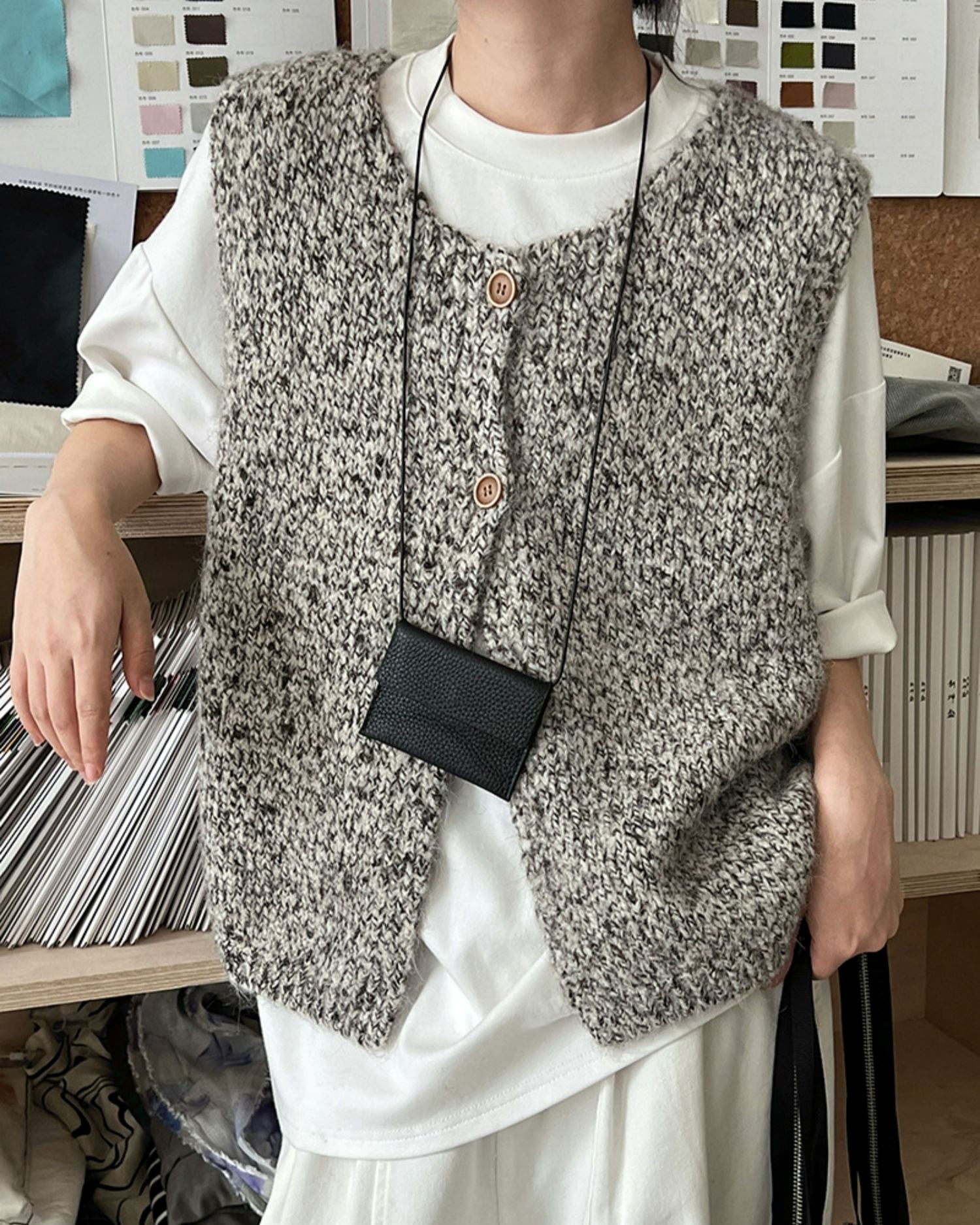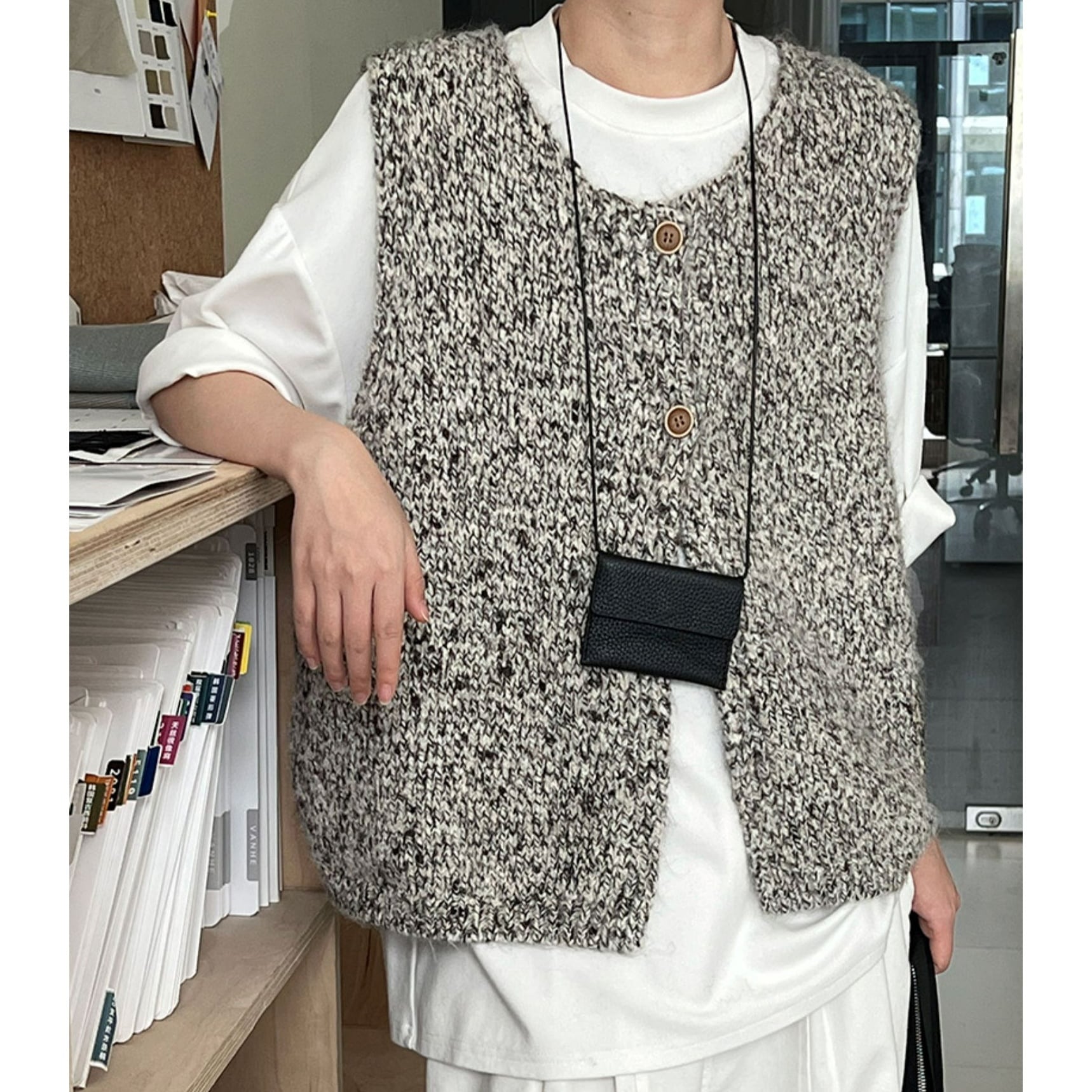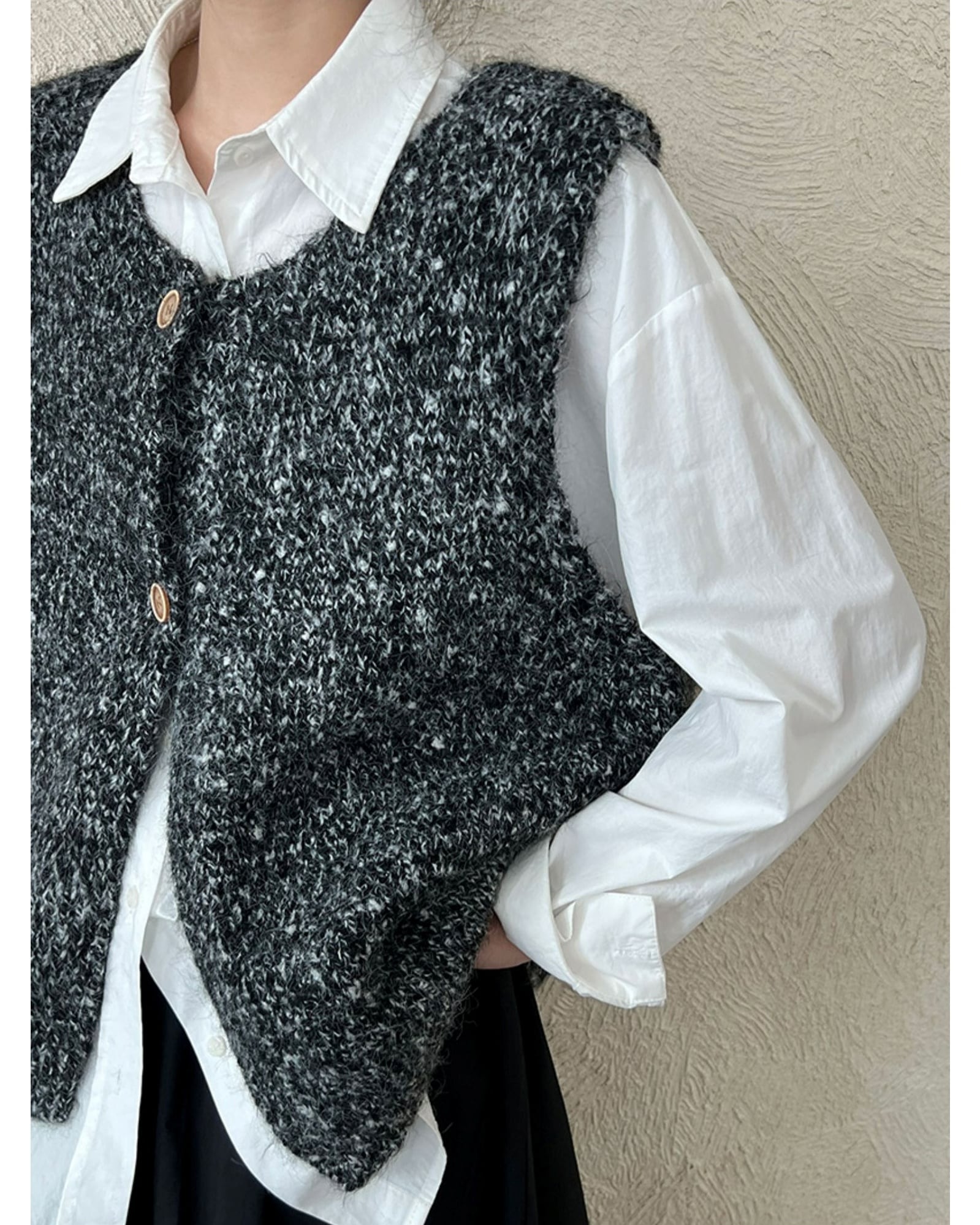 前ボタン付きのニットベストは、カットソーやワンピースとのレイヤードスタイルにぴったり。ほどよい厚みで、寒い季節にはジャケットやコートのインナーとしても活躍します。着こなしのアクセントにもなり、シーズン問わず長く楽しめる一枚です。 ................................................. ■ color ivory , gray , black ■ material ポリエステル ナイロン ウール スパンデックス ■ size フリーサイズ F:肩幅 42cm 胸囲 114cm 着丈 56cm ※採寸方法により多少の誤差がある場合がございます ■ モデル身長:162cm [ 商品管理番号:j-0063] ▼ blanks人気ランキング https://www.blanksonline.shop/categories/3622302 ▼ 新商品・SALE情報をチェック! https://www.blanksonline.shop/ ▼ Instagram https://www.instagram.com/blanks.official/ ▶ ご購入時こちらを必ずお読みくださいませ 【 お買い物にあたってのご注意事項 】 https://www.blanksonline.shop/blog/2020/12/17/145916