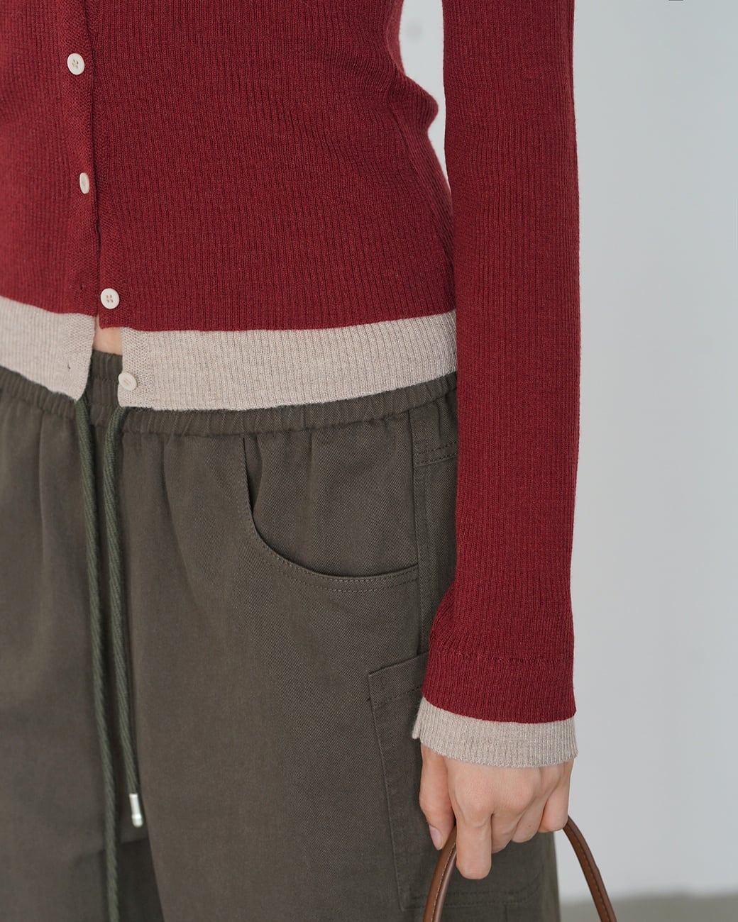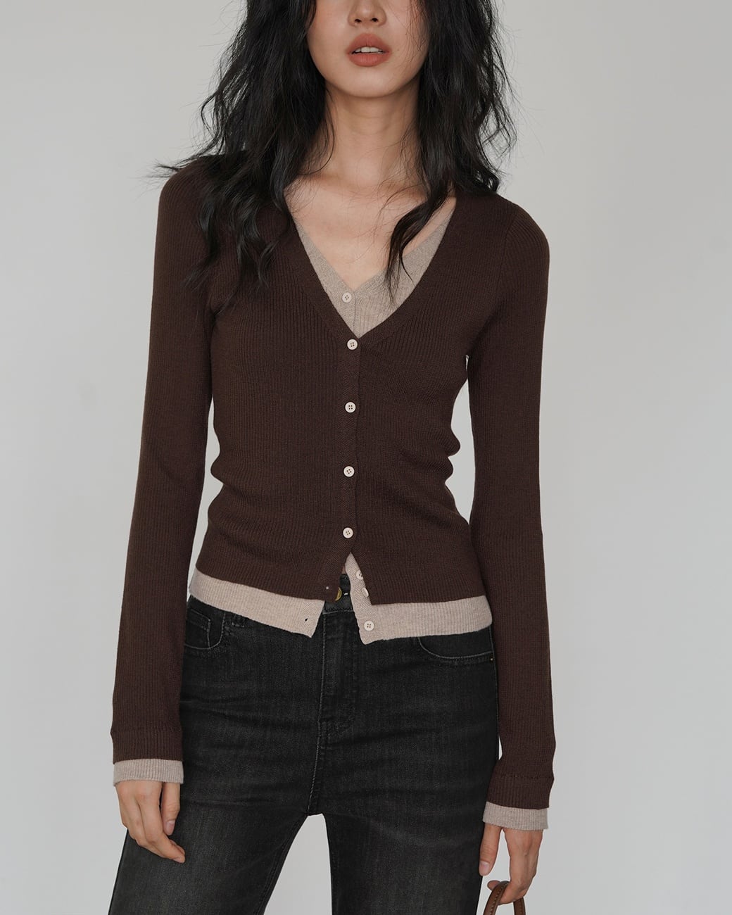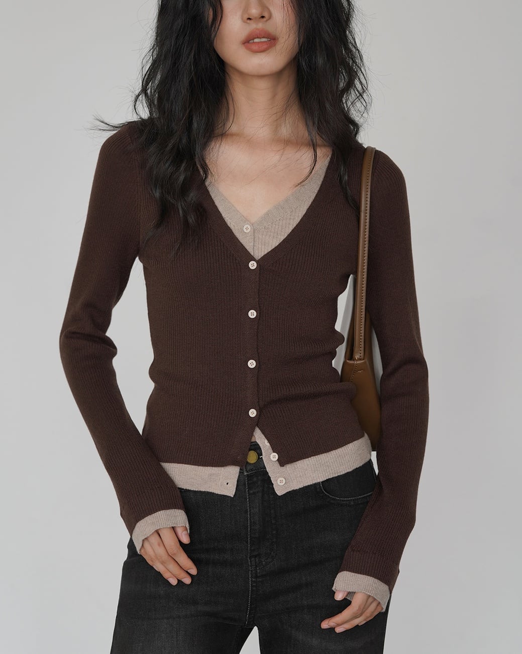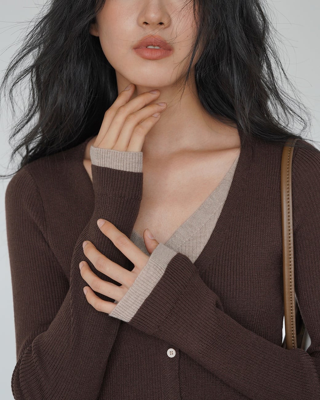 配色デザインが目を引くバイカラースリムカーディガン。フィット感のあるラインでスタイルアップも叶い、デイリーのカジュアルなコーディネートに取り入れやすいく、Vネックラインでデコルテラインも女性らしい一着です。