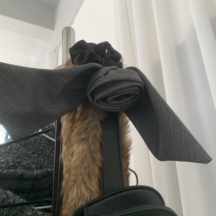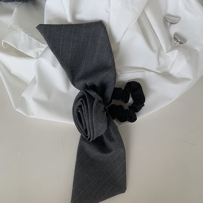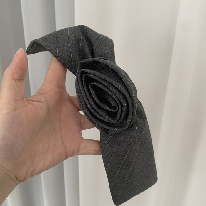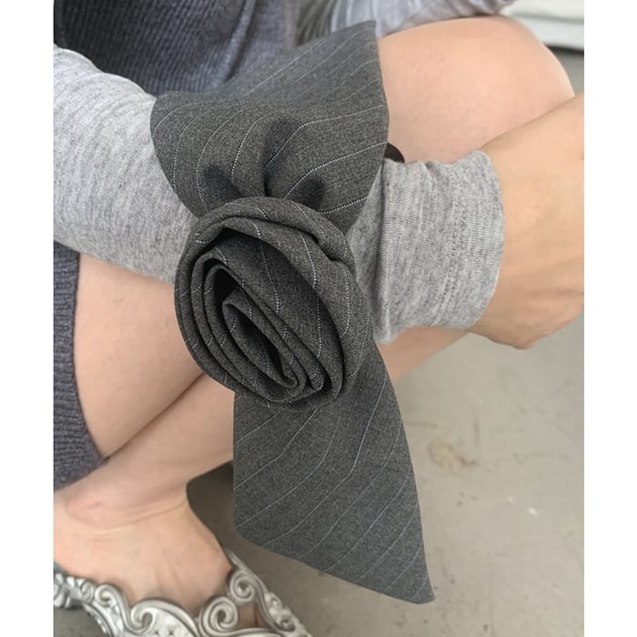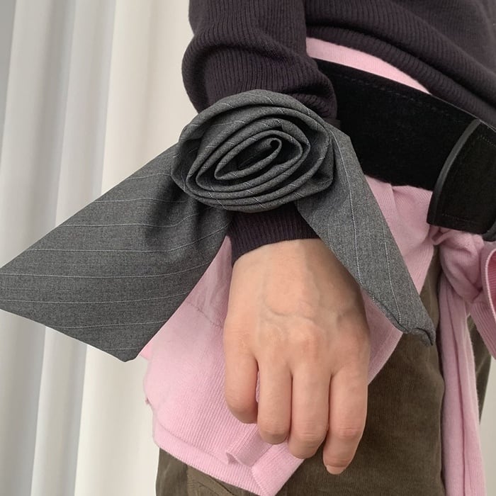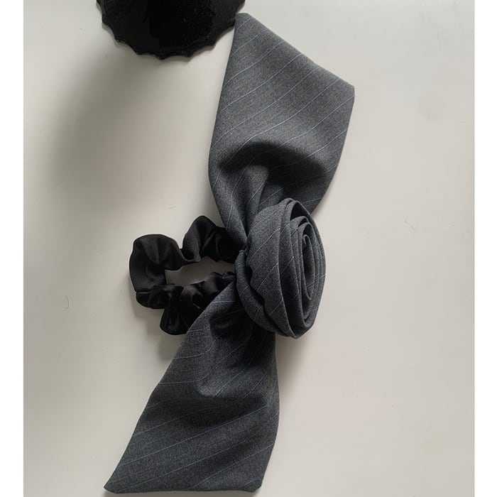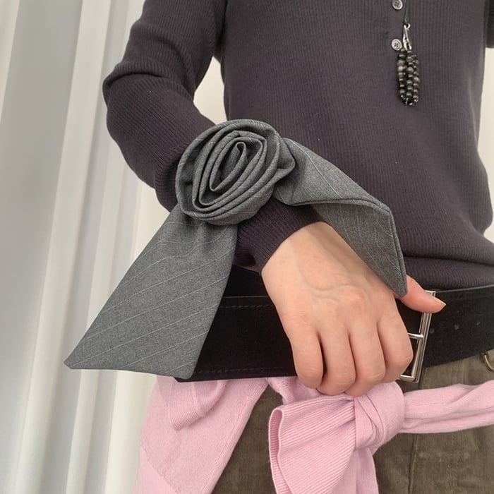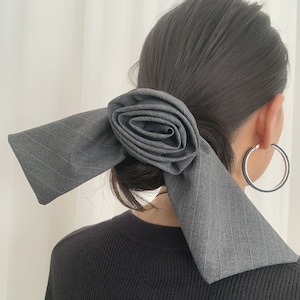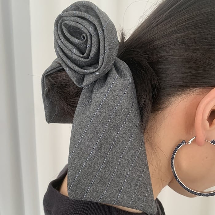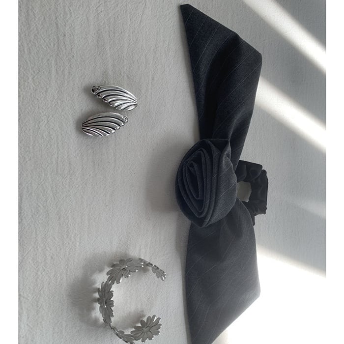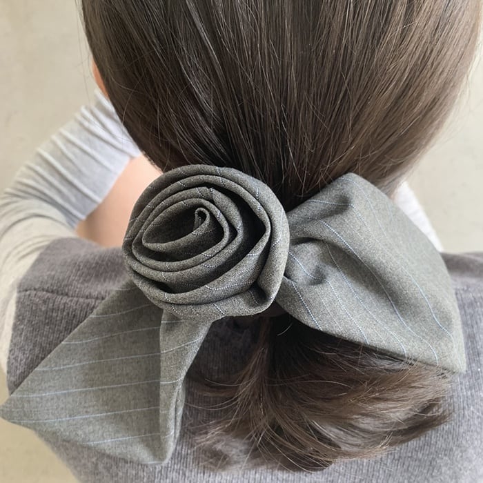 レディライクなバラモチーフと、シックなグレーカラーが絶妙にマッチしたシュシュ。甘すぎないデザインで、大人の女性にもぴったり。モードな空気感をまといつつ、さりげなく個性を引き立てる一品です。