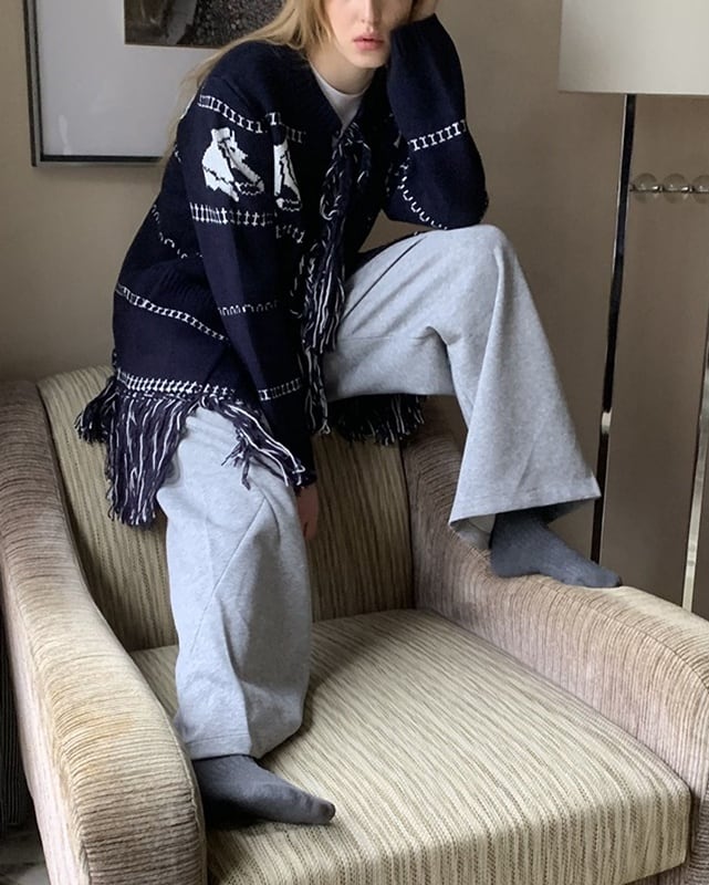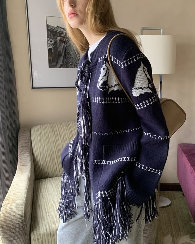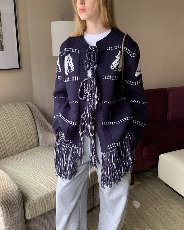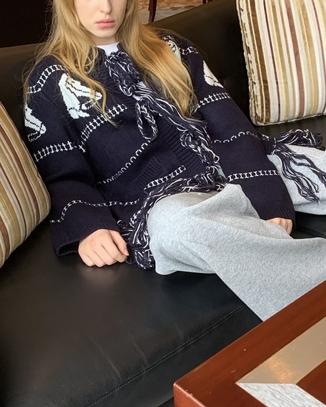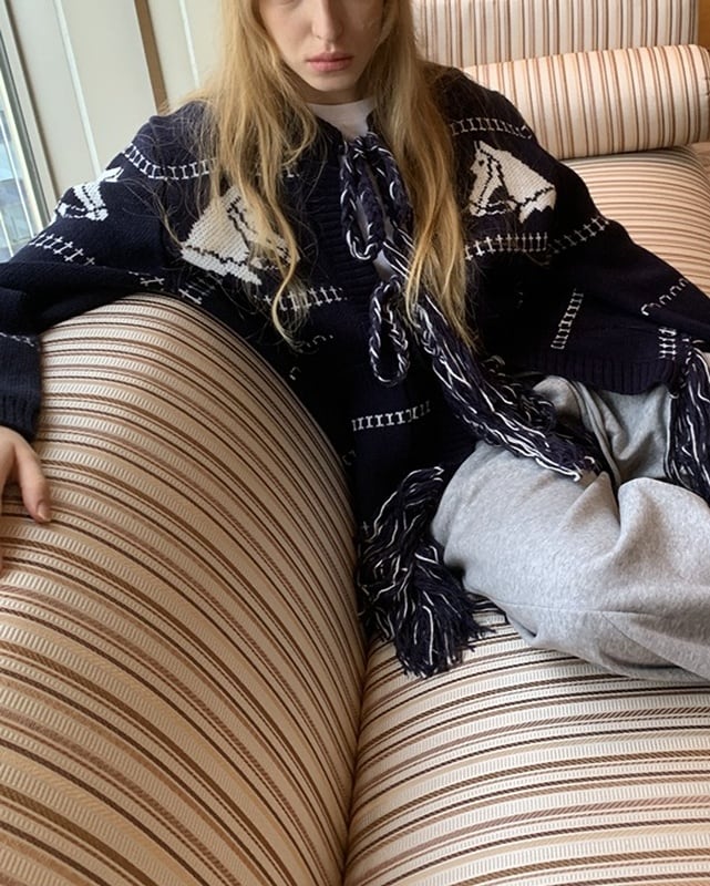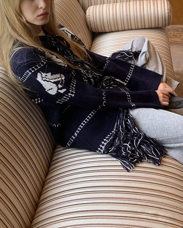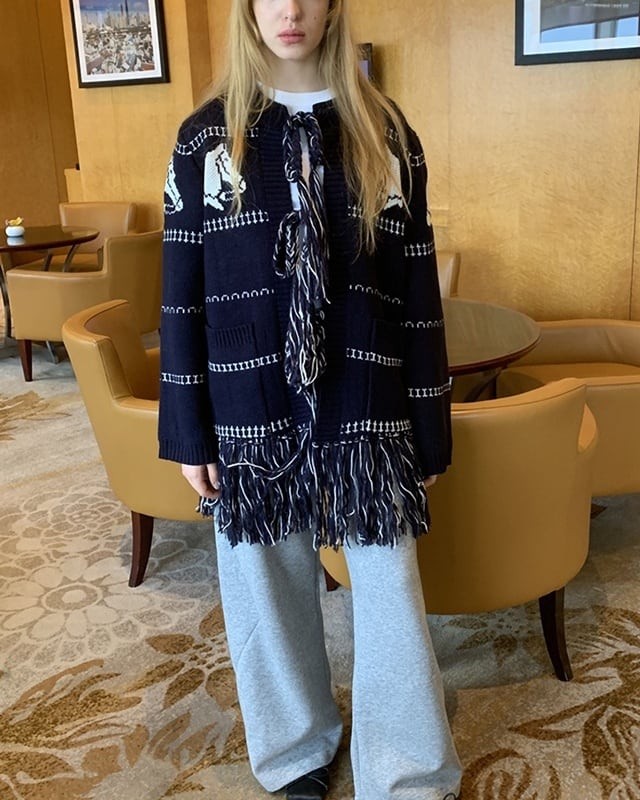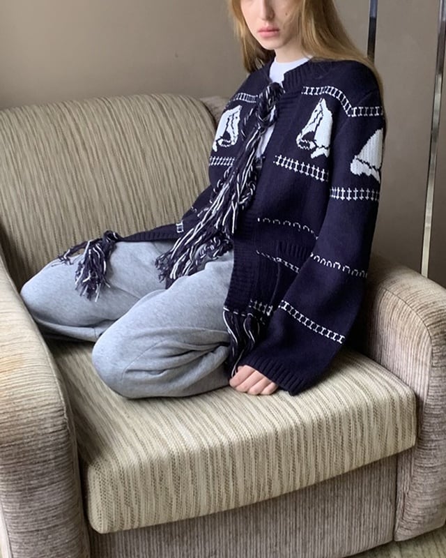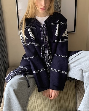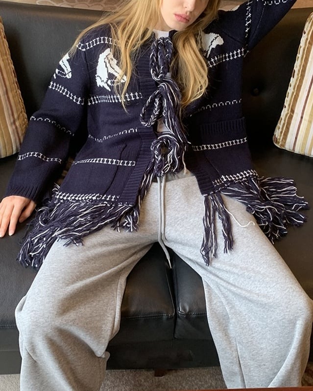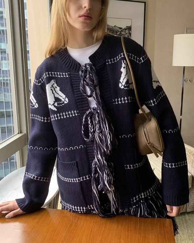 ネイビーカラーに映える馬柄が目を引く、遊び心のあるロングカーディガン。裾のフリンジとフロントのリボンがさりげないアクセントに。腰がしっかり隠れる長め丈で、体型カバーにも◎。さらっと羽織れて、軽めのアウター代わりとしても活躍する一着です。