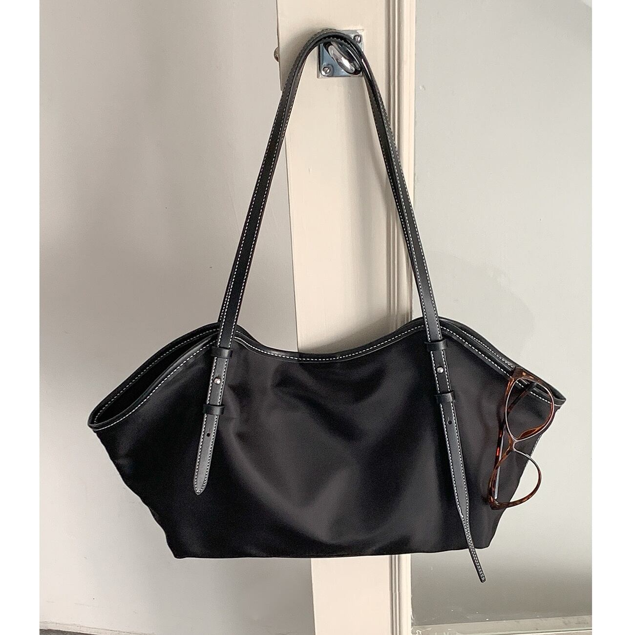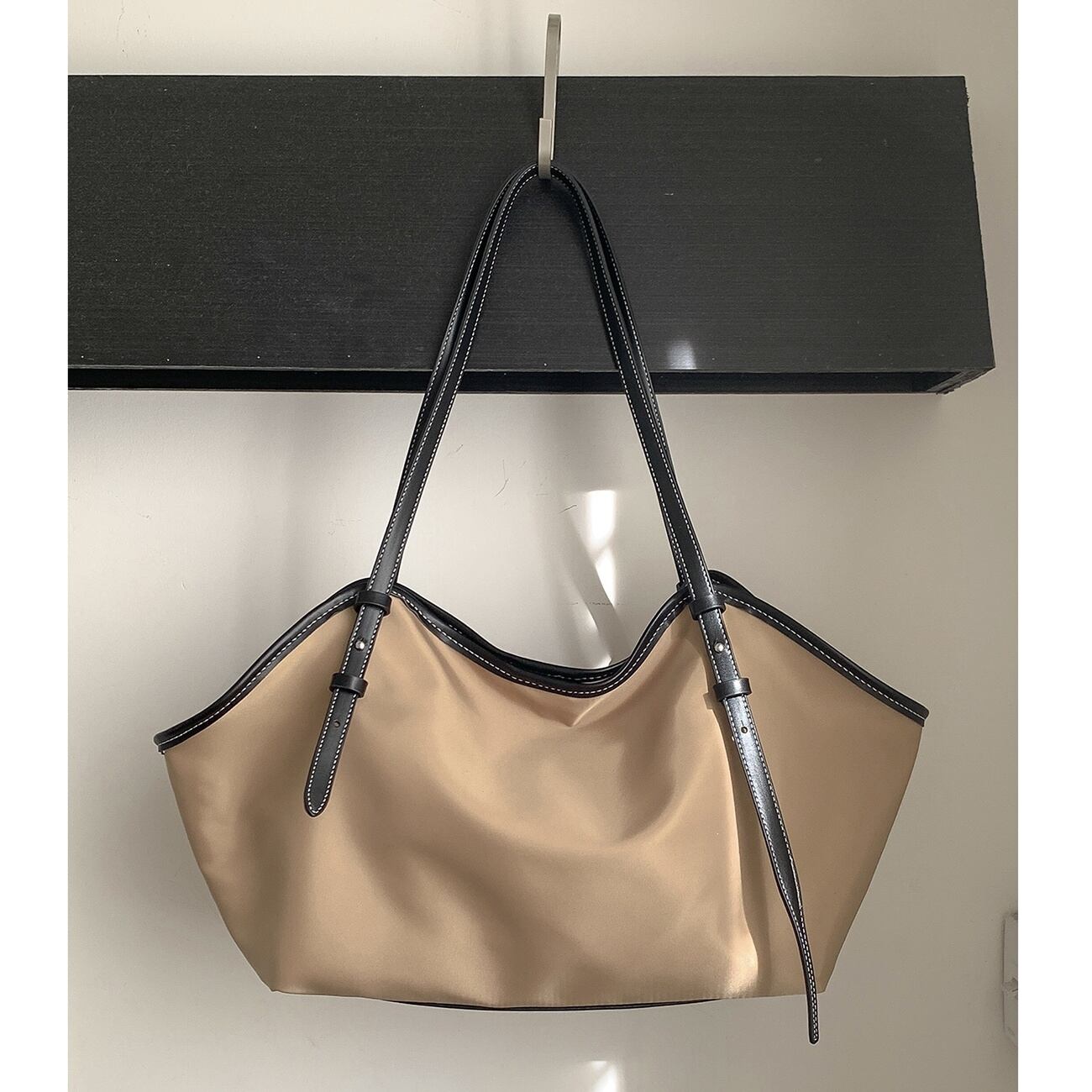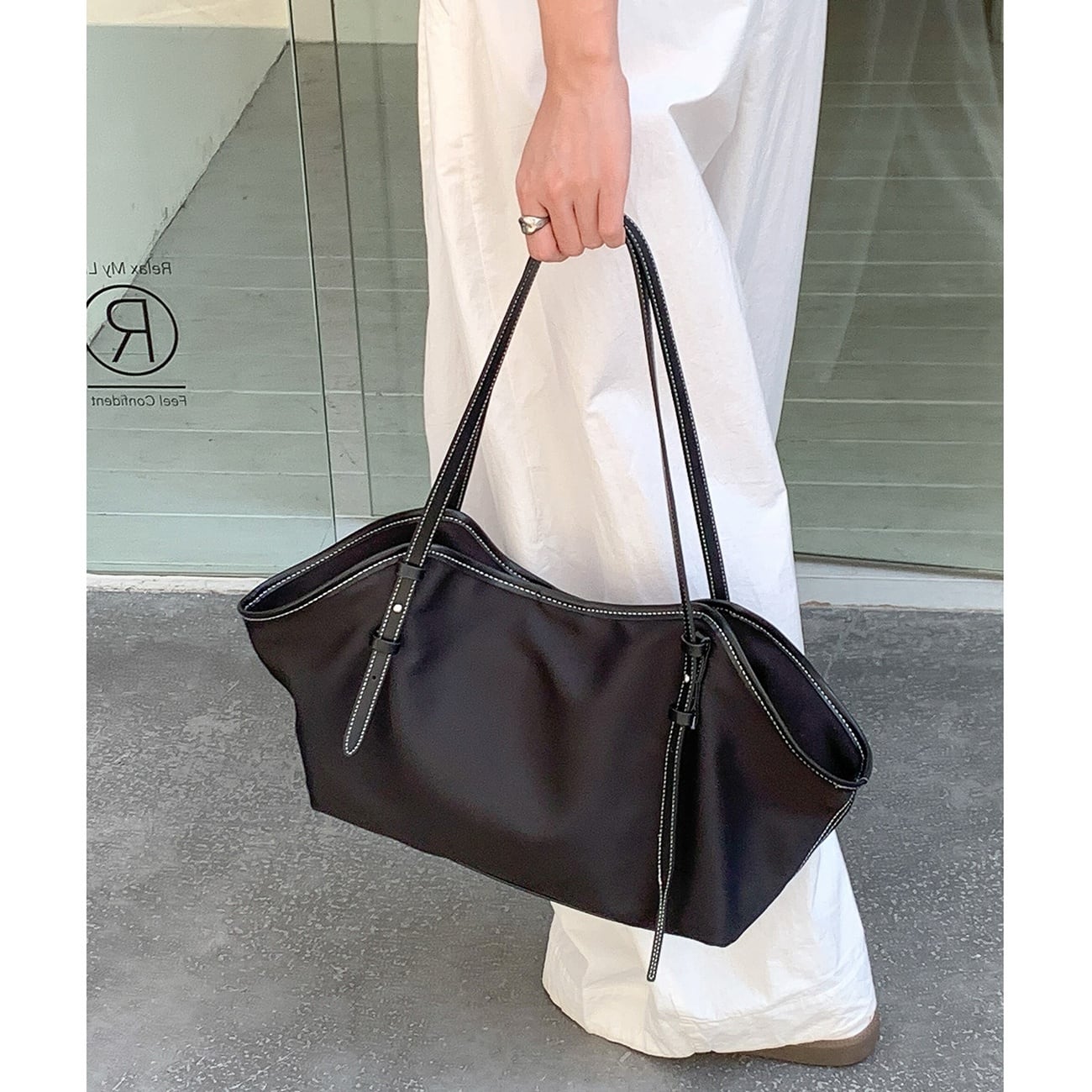 ステッチがアクセントになった、大きめサイズのトートバッグ。口元はボタンで開け閉め簡単、肩掛けしやすい長めの持ち手で、荷物が多い日もスマートに持てる、上品で機能的なバッグです。