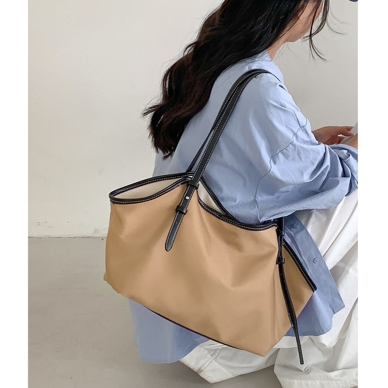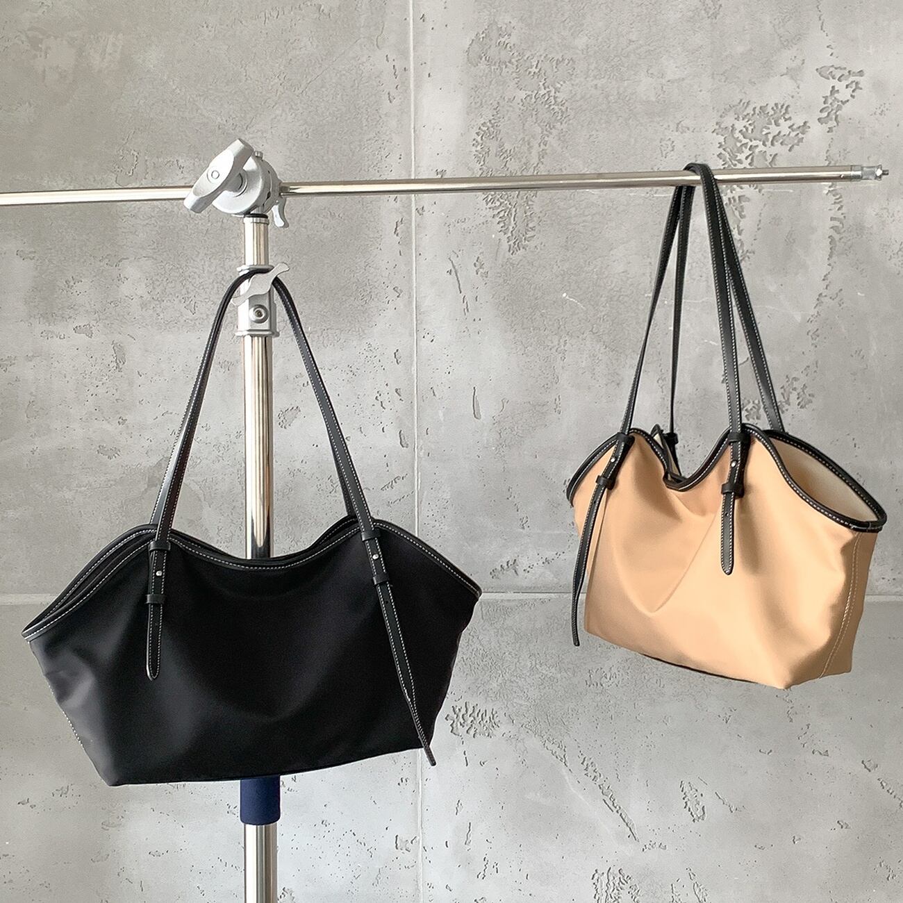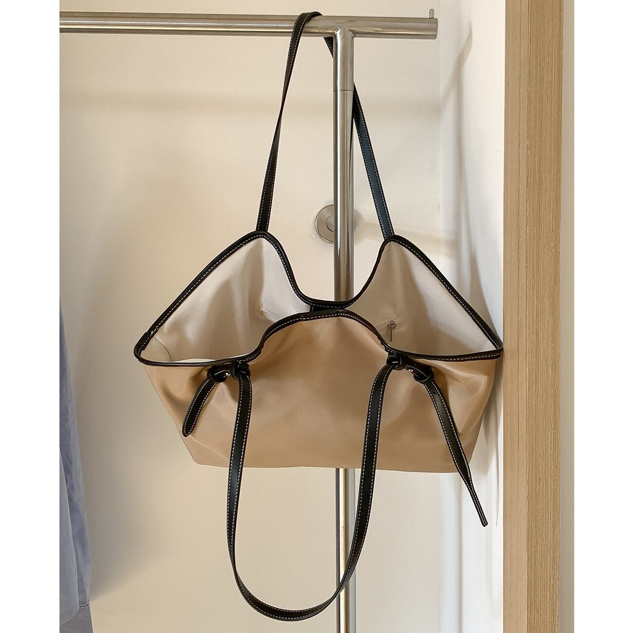 ステッチがアクセントになった、大きめサイズのトートバッグ。口元はボタンで開け閉め簡単、肩掛けしやすい長めの持ち手で、荷物が多い日もスマートに持てる、上品で機能的なバッグです。