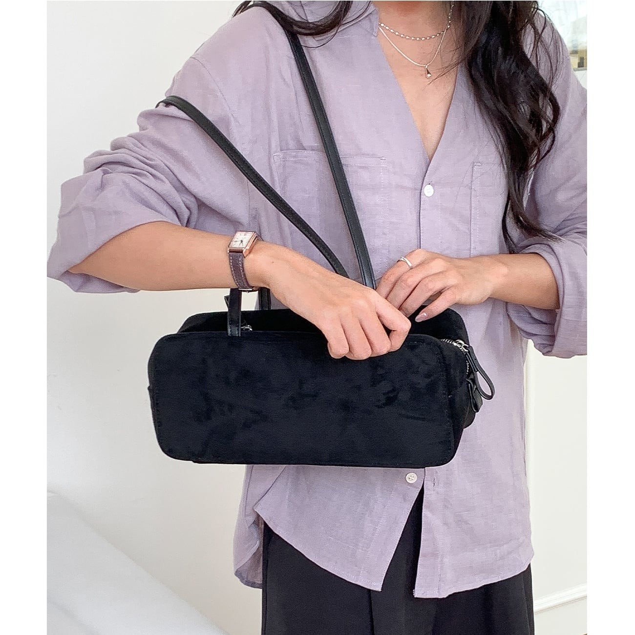 しっかり閉じられるジップ仕様の横長口と、肩掛けしやすい長めの持ち手が魅力のショルダーバッグ。使い勝手のよさとスタイリッシュさを両立したデザイン。シンプルなデザインで、カジュアルにもきれいめにも合わせやすく、毎日のコーデに寄り添います。 ................................................. ■ color ivory , blue , black , leopard ■ material フェイクスウェード ■ size one size 横幅:31cm 高さ:12.5cm マチ:11cm ショルダーベルト長さ:34.5cm ※採寸方法により多少の誤差がある場合がございます [ 商品管理番号:j-0133 ] ▼ blanks人気ランキング https://www.blanksonline.shop/categories/3622302 ▼ 新商品・SALE情報をチェック! https://www.blanksonline.shop/ ▼ Instagram https://www.instagram.com/blanks.official/ ▶ ご購入時こちらを必ずお読みくださいませ 【 お買い物にあたってのご注意事項 】 https://www.blanksonline.shop/blog/2020/12/17/145916
