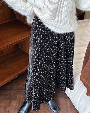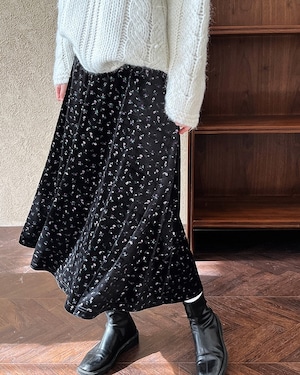ベロア生地に、白と紫の小花柄が映えるロングスカート。柔らかな光沢感と、ややフレアなシルエットが女性らしさを引き立てます。ブラックベースで甘くなりすぎず、大人フェミニンな着こなしにぴったりです。
