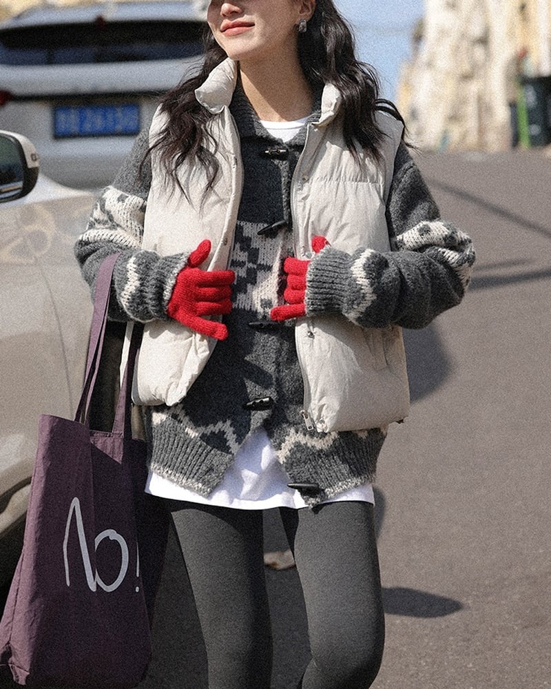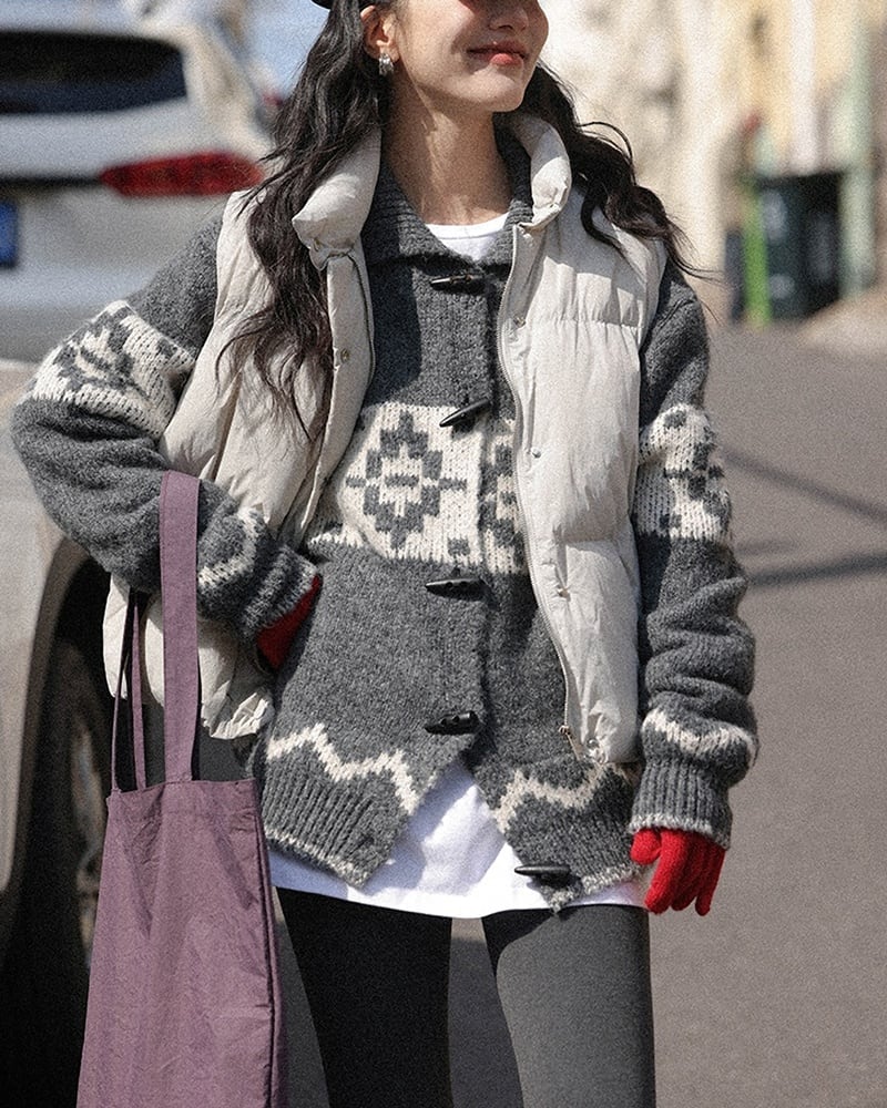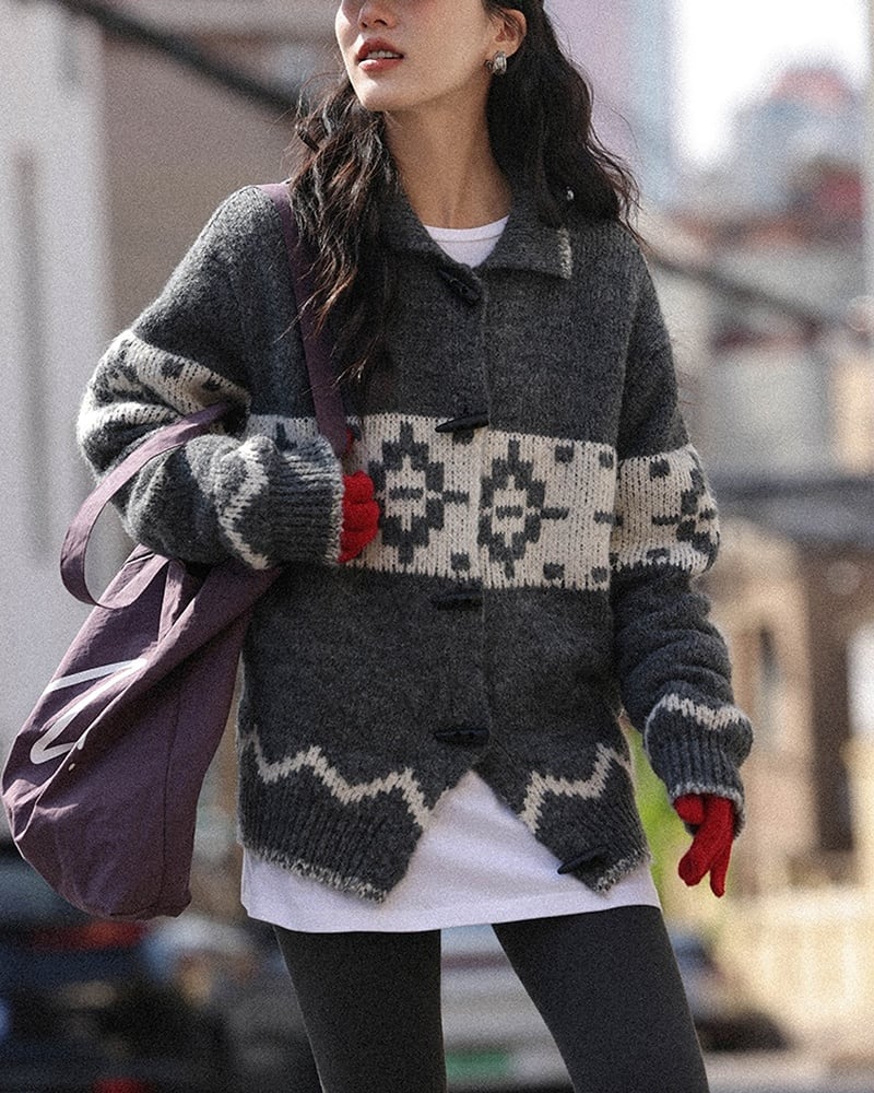 グレーベースにホワイトのアクセントカラーが映えるノルディック柄ニットカーディガン。カラー付きの前ボタン仕様で、1枚で主役になるあたたかみのあるデザインです。落ち着いた配色ながら存在感があり、冬コーデに季節感をプラス。羽織るだけでほっこりとした雰囲気を演出してくれます。