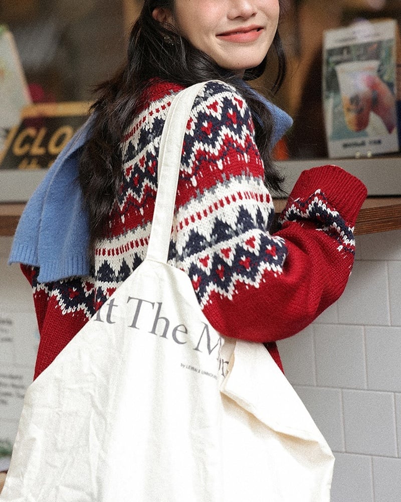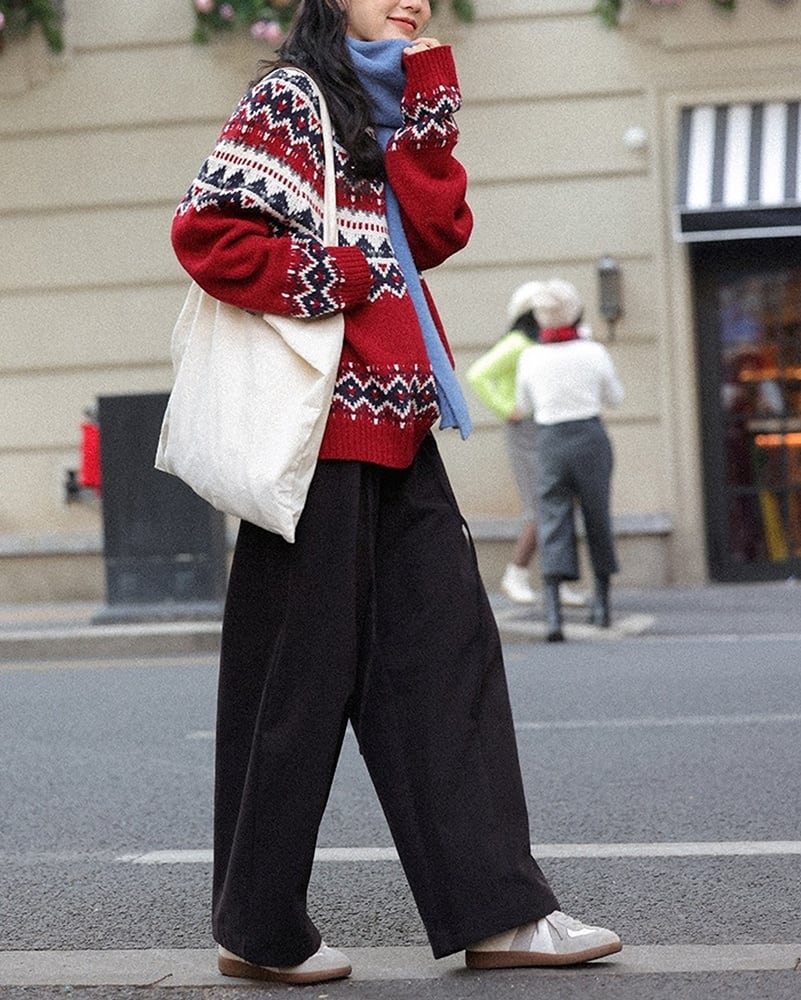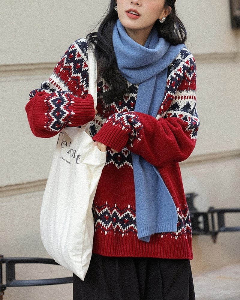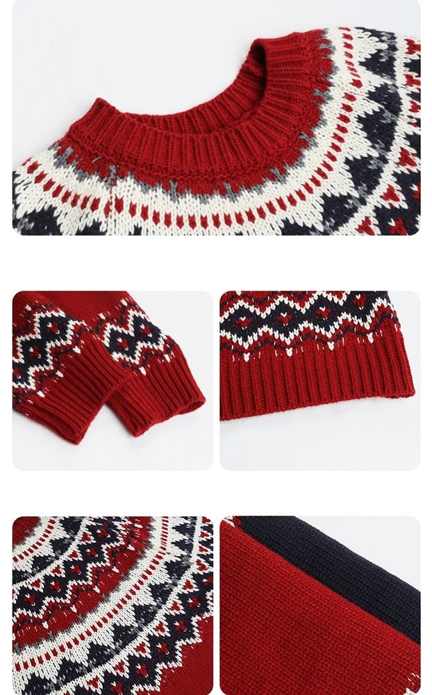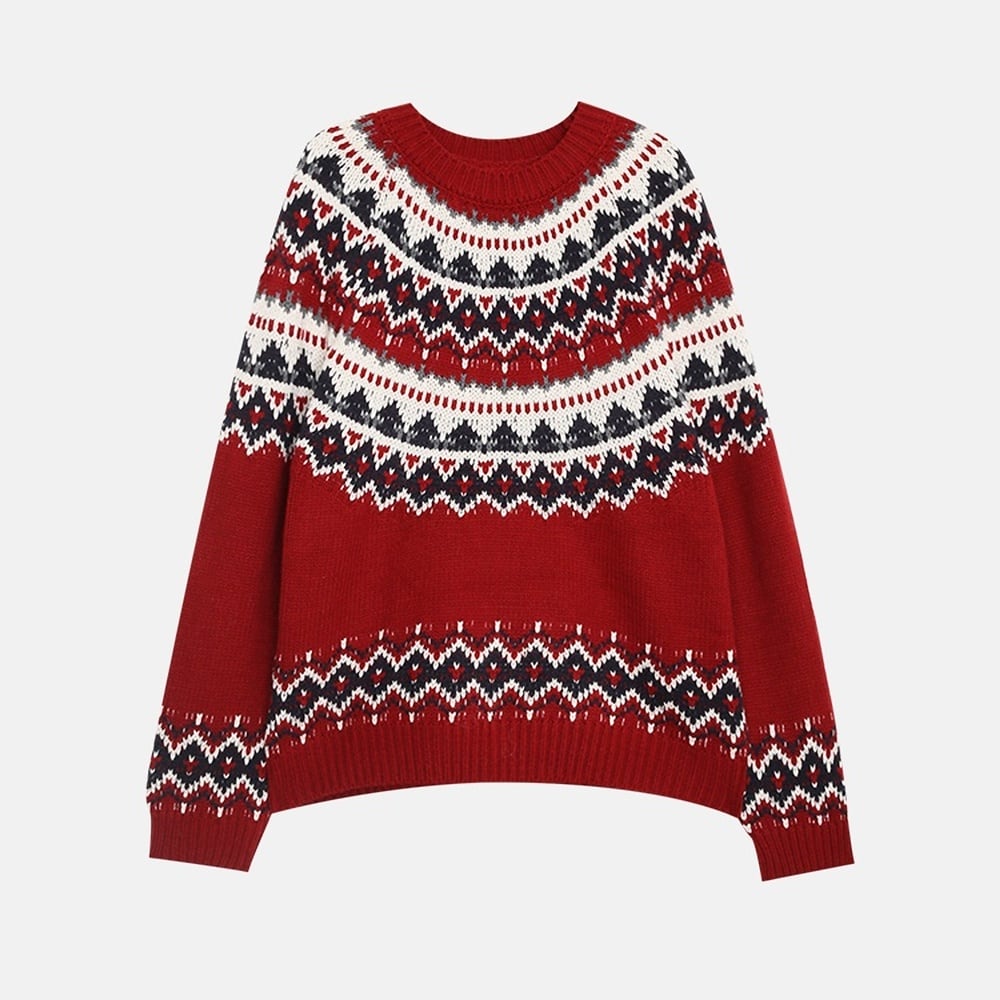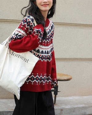 冬の定番・ノルディック柄が目を引くあたたかみのあるニット。ゆったりとしたシルエットでリラックス感があり、重ね着もしやすいデザインです。柔らかな風合いが季節感を引き立て、1枚で主役になる存在感が魅力。カラーは華やかな red と、落ち着いた雰囲気の navy の2色展開で、冬コーデにぴったりです。