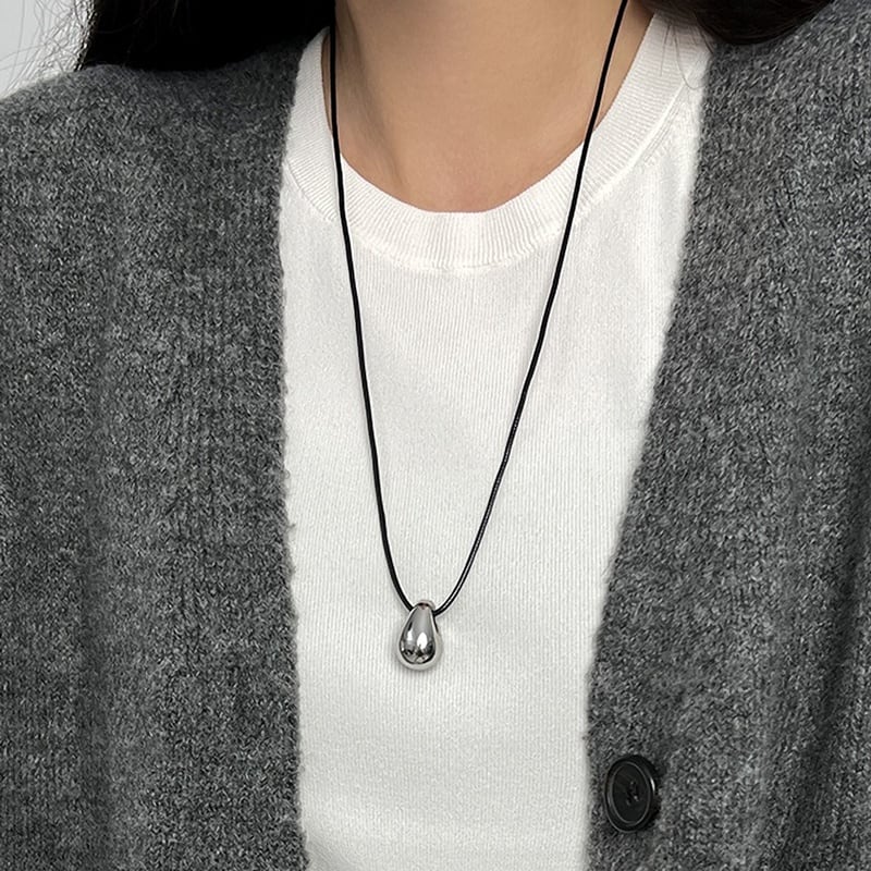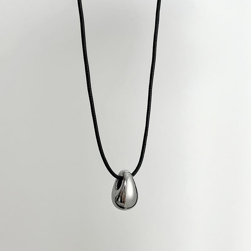 シルバーカラーのドロップ型ペンダントトップが印象的なネックレス。フェイクレザーコードを使用し、程よくカジュアルな雰囲気に仕上げました。長めのデザインでコーディネート全体のバランスが取りやすく、シンプルからきれいめまでスタイルを選ばず活躍。デイリーに取り入れやすいアクセサリーです。