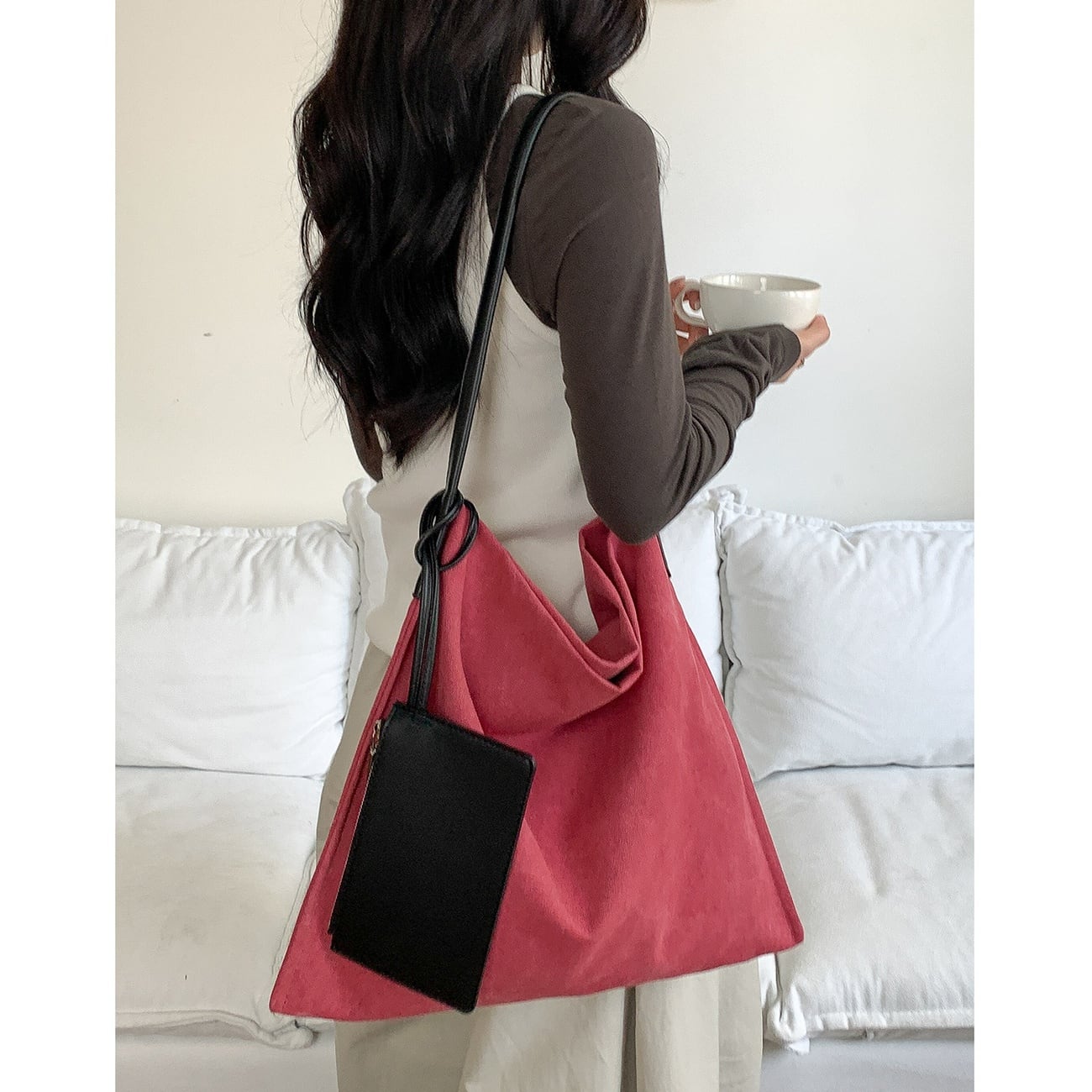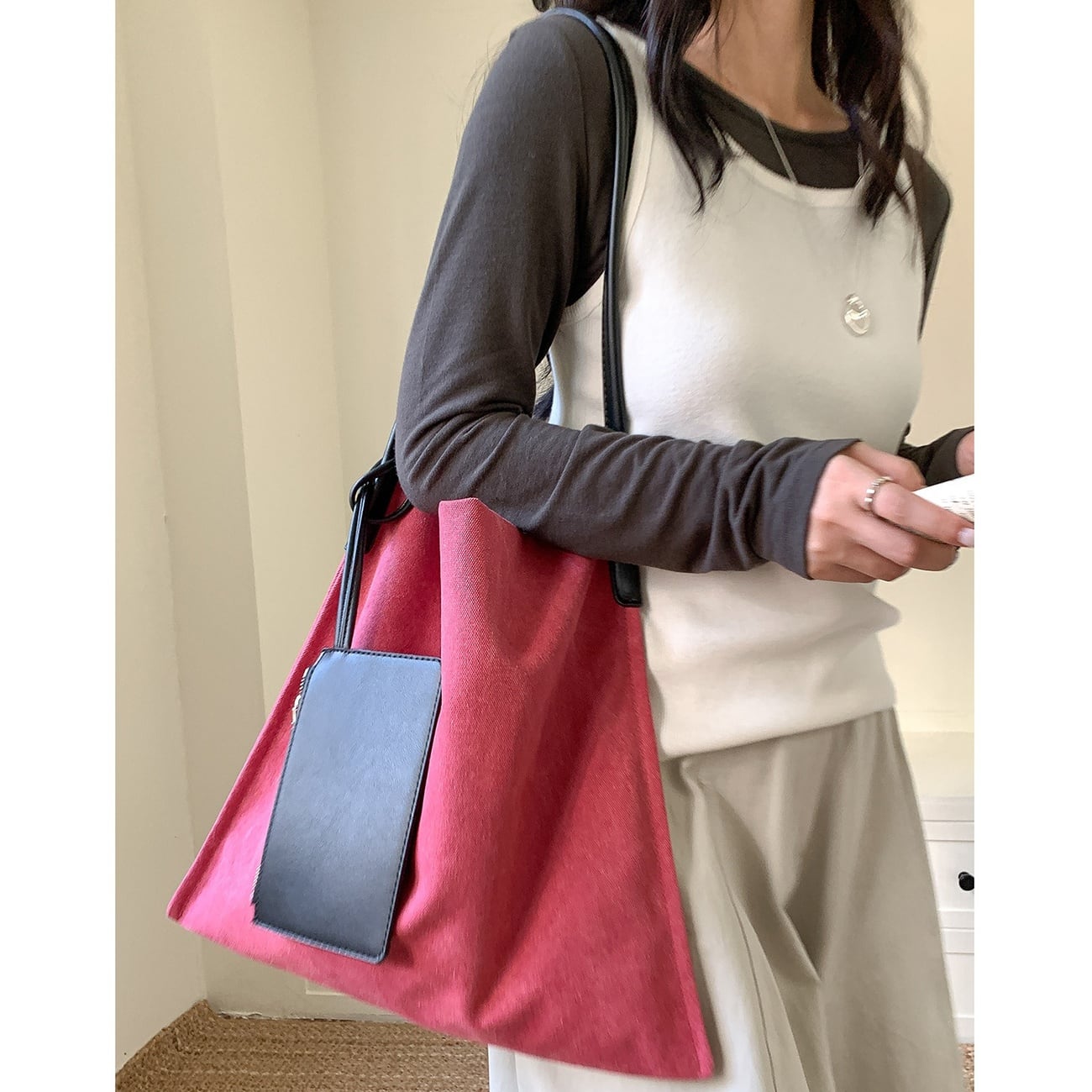 すっきりとしたスクエア型が印象的なショルダーバッグ。肩掛けできるデザインで、日常使いしやすい程よいサイズ感が魅力です。マチなし仕様のため、体に沿ってスマートに持てるのもポイント。小物整理に便利なポーチ付きで実用性も◎ベージュ・レッド・グリーン・ブラックの4色展開です。