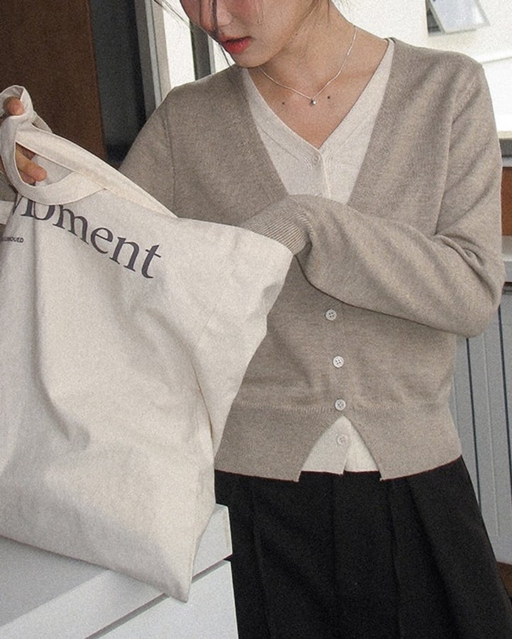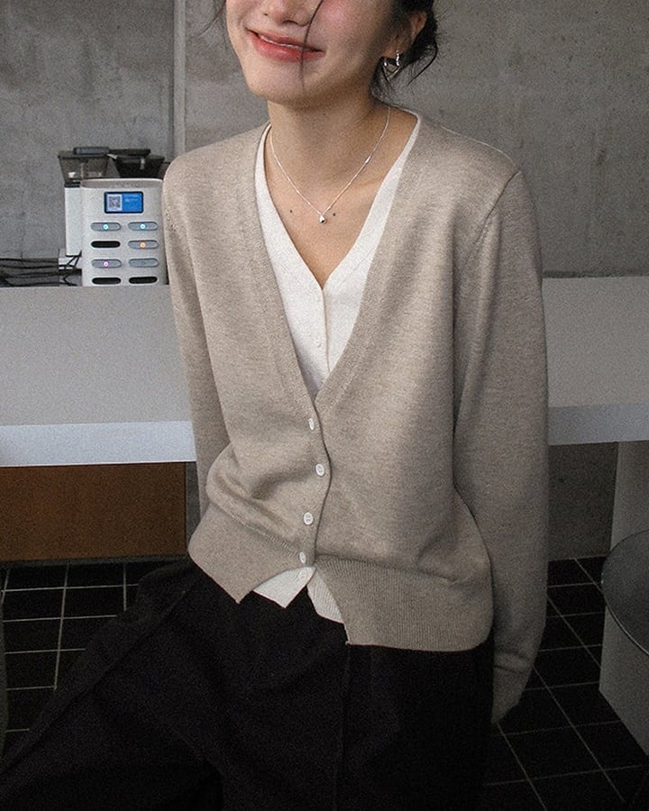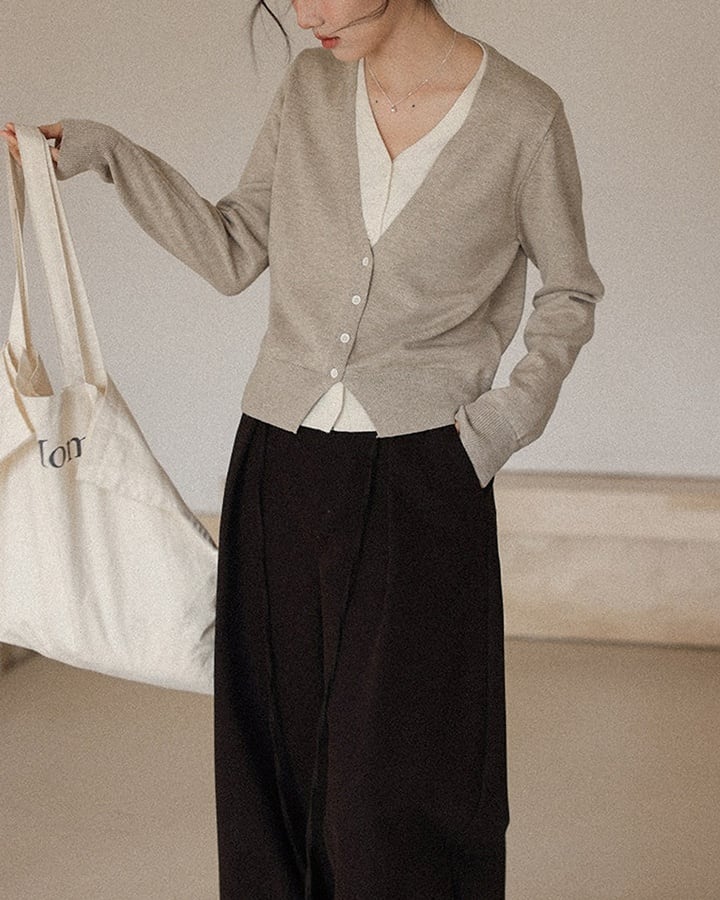 レイヤード風デザインが目を引くカーディガン。ホワイトをベースにベージュを重ねたような配色が、さりげなく奥行きのある表情を演出します。女性らしい程よくスッキリとしたシルエットで、羽織るだけで上品な印象に。Vネックがデコルテをきれいに見せ、シンプルながらも飽きの来ない一枚です。
