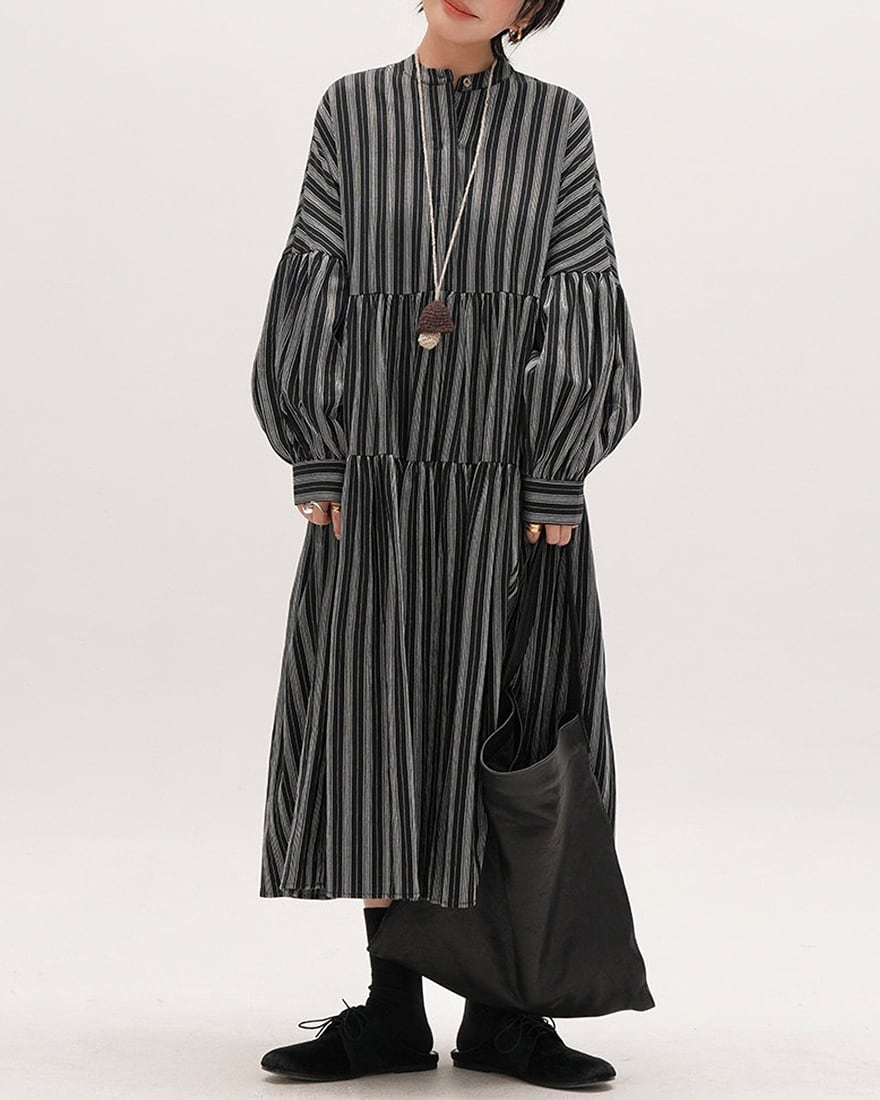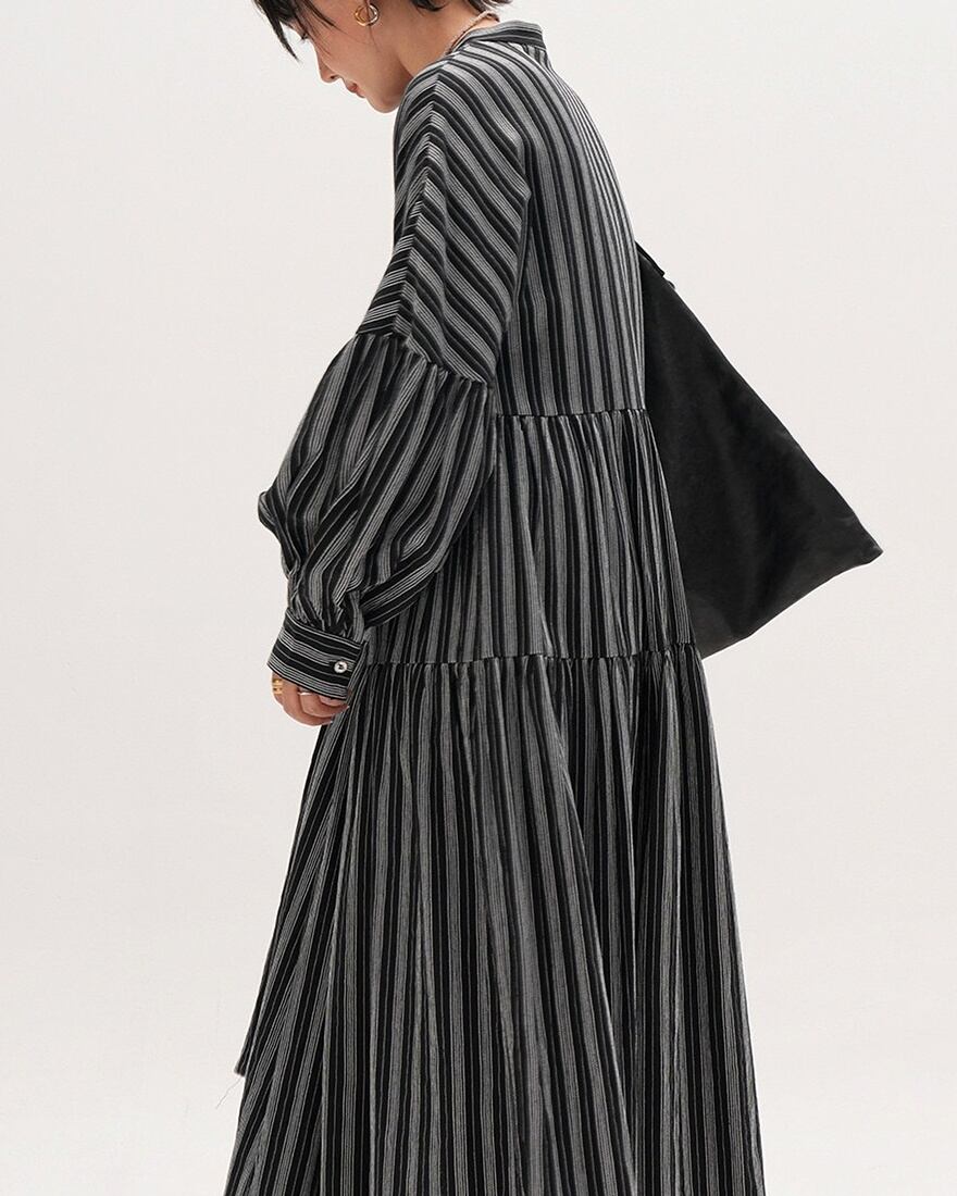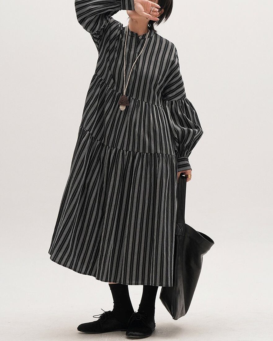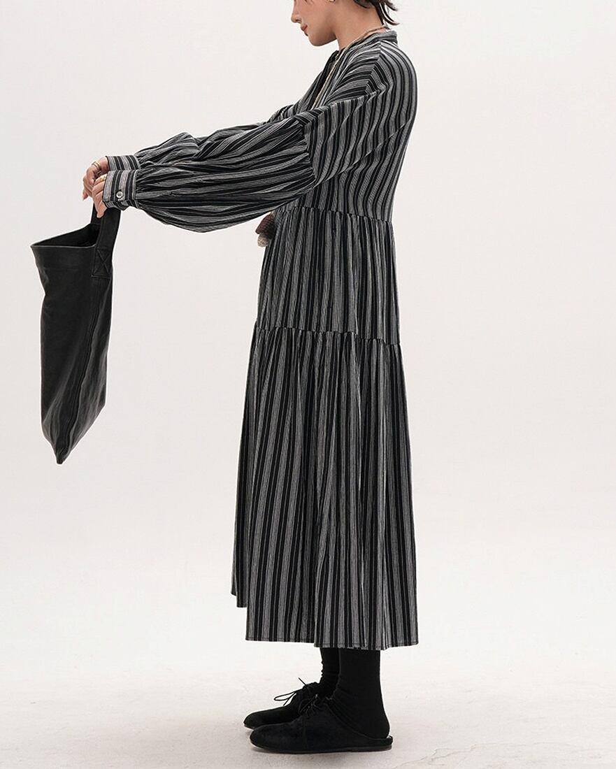 ブラックベースにホワイトのストライプを配した、落ち着きのある印象のワンピース。縦ラインを強調する柄がすっきりとした見え方を叶えます。裾に向かって広がるフレアシルエットが女性らしく、動くたびにやわらかな表情を演出。そではふわっと広がり、シンプルながらも程よい華やかさをプラスします。