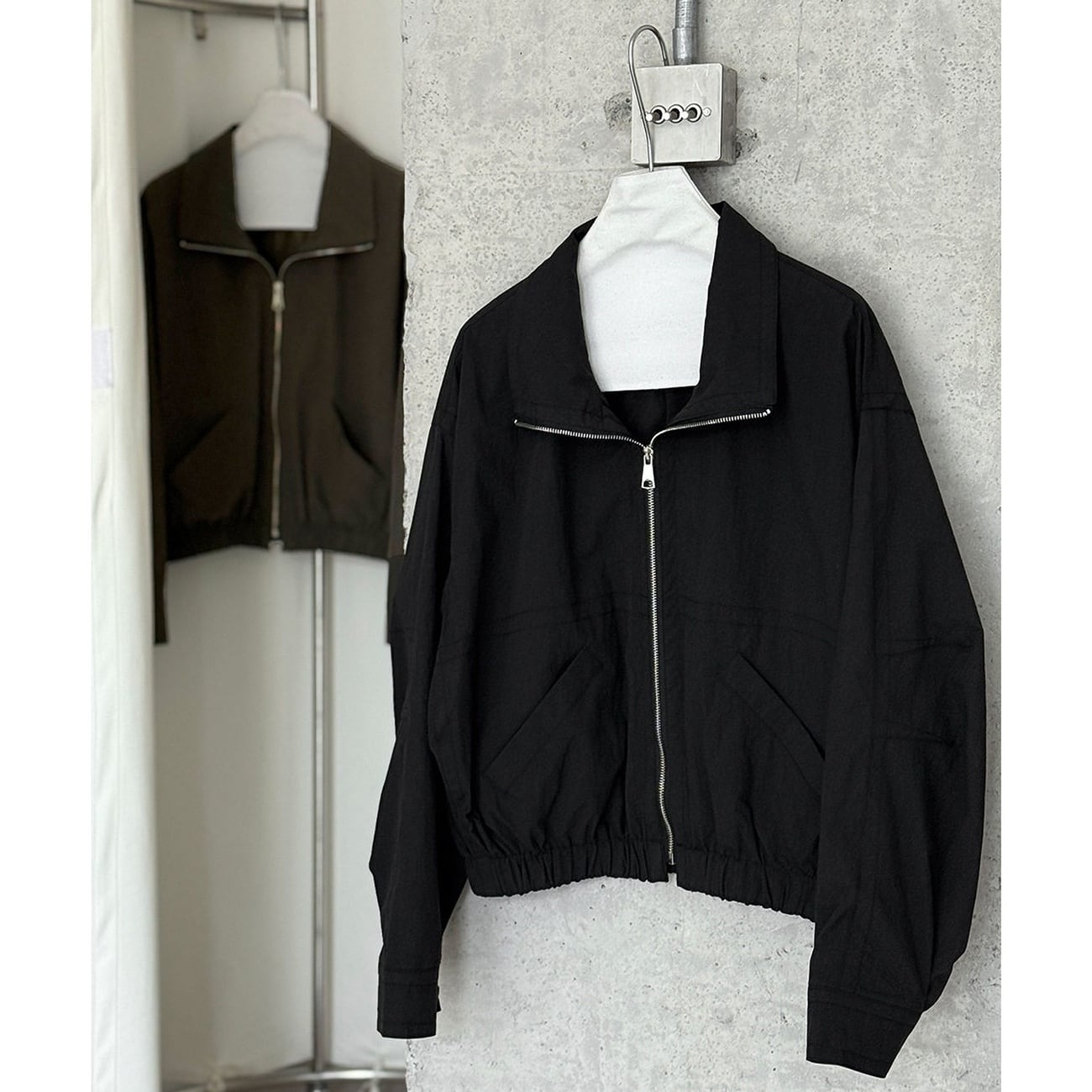 ハイスタンドカラーがポイントのショート丈ジャケット。ブルゾン風のカジュアルなデザインで、さっと羽織るだけでこなれた雰囲気に仕上がります。軽い着心地なので季節の変わり目にも使いやすく、デイリーに活躍。ブラックとカーキのベーシックな2色展開で、さまざまなスタイリングに自然に馴染むアイテムです。