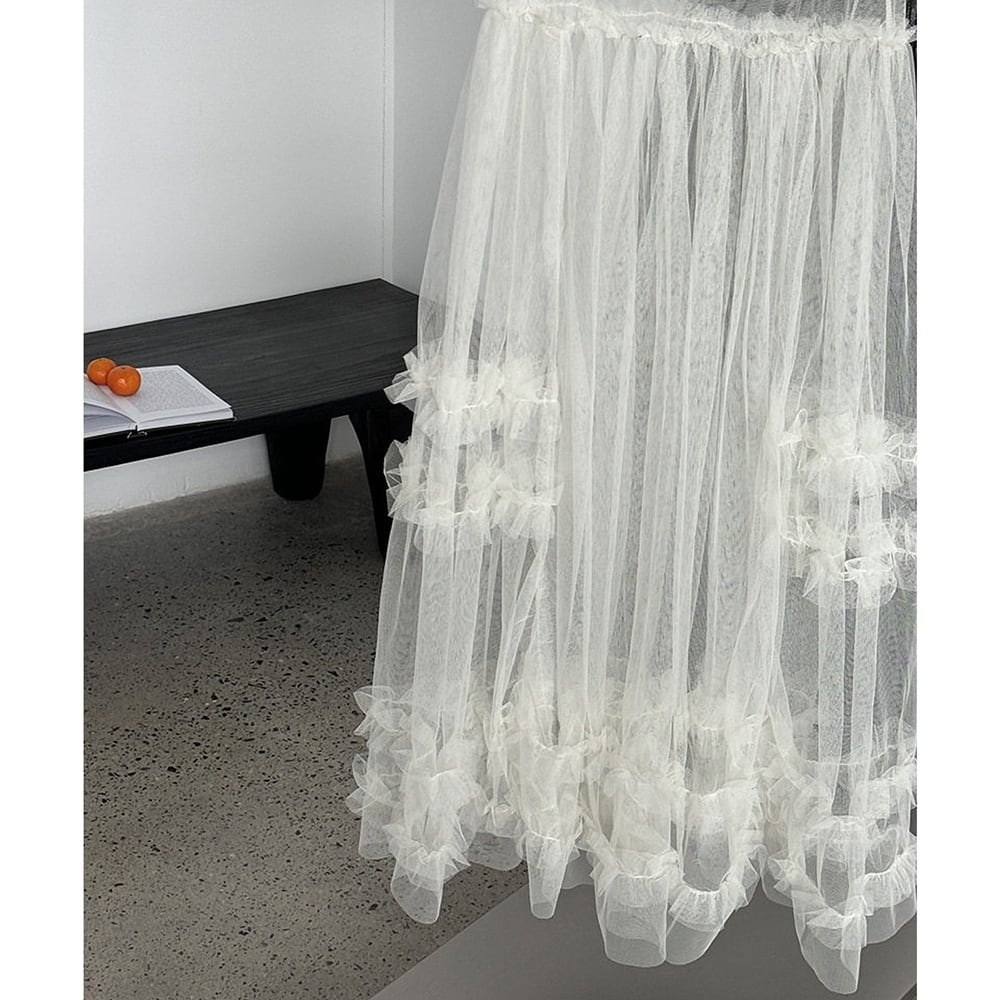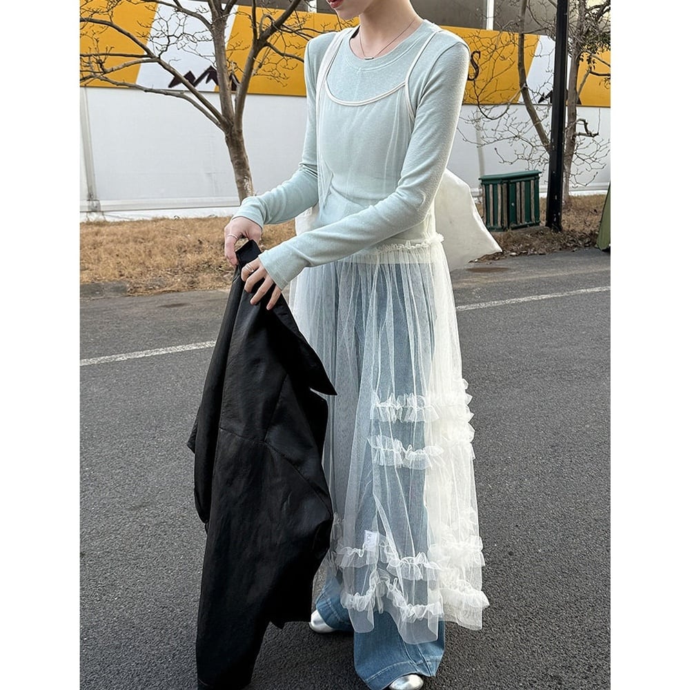 軽やかなメッシュチュチュデザインが印象的なキャミロングワンピース。ギャザーが生み出すふわっとしたボリューム感と、レイヤード仕様の奥行きがポイントです。ホワイトカラーでスタイリングに取り入れやすく、カジュアルにもきれいめにもマッチ。いつものコーデに重ねるだけで、柔らかなニュアンスを加えてくれるアイテムです。