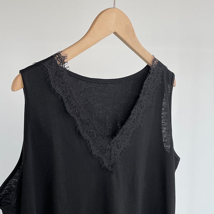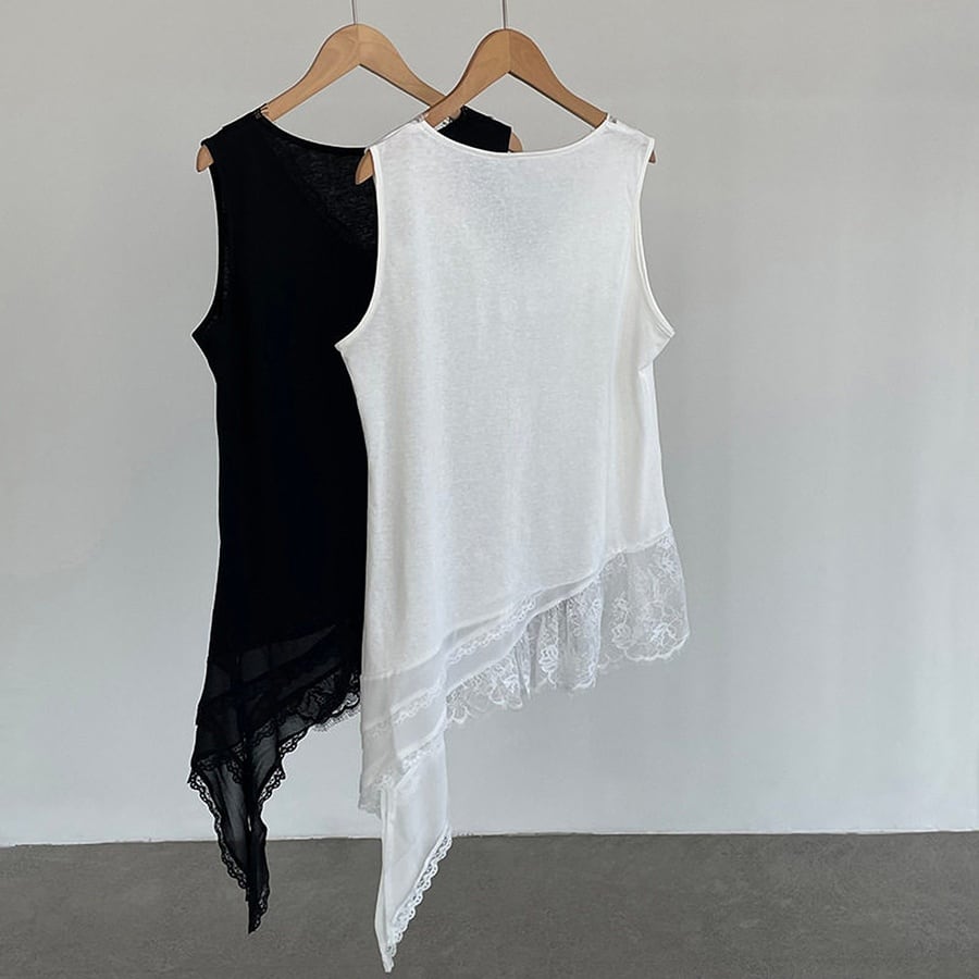 片側だけ長く仕上げた裾ラインが印象的な、アシンメトリーのレーストップス。ノースリーブ仕様と深いVネックで、レースながらも軽やかですっきりとした印象に仕上げました。インナーやアウターとの重ね着もしやすく、レイヤードスタイルのアクセントとして活躍します。