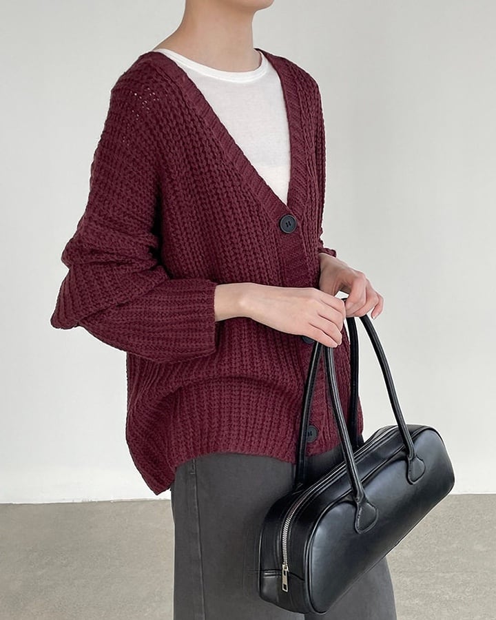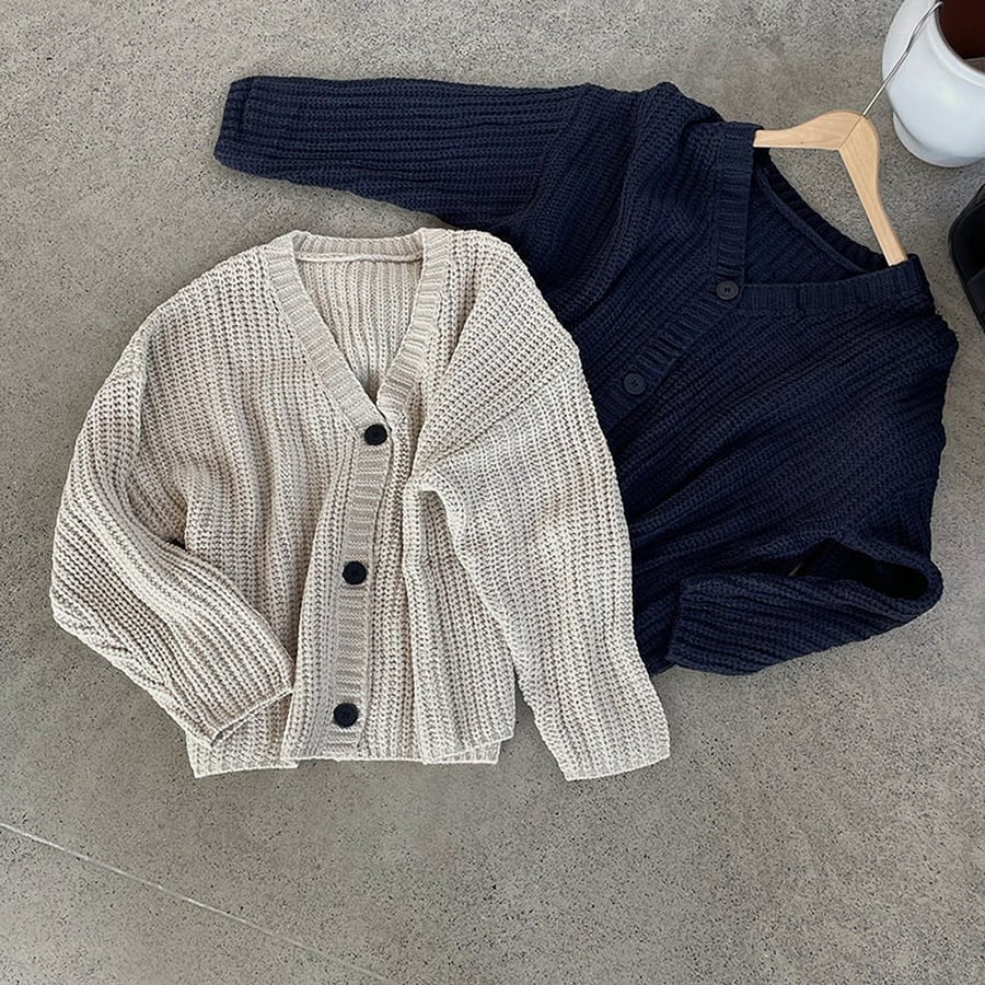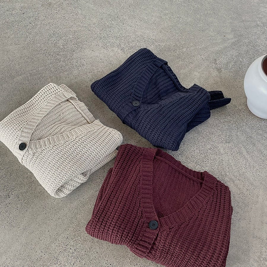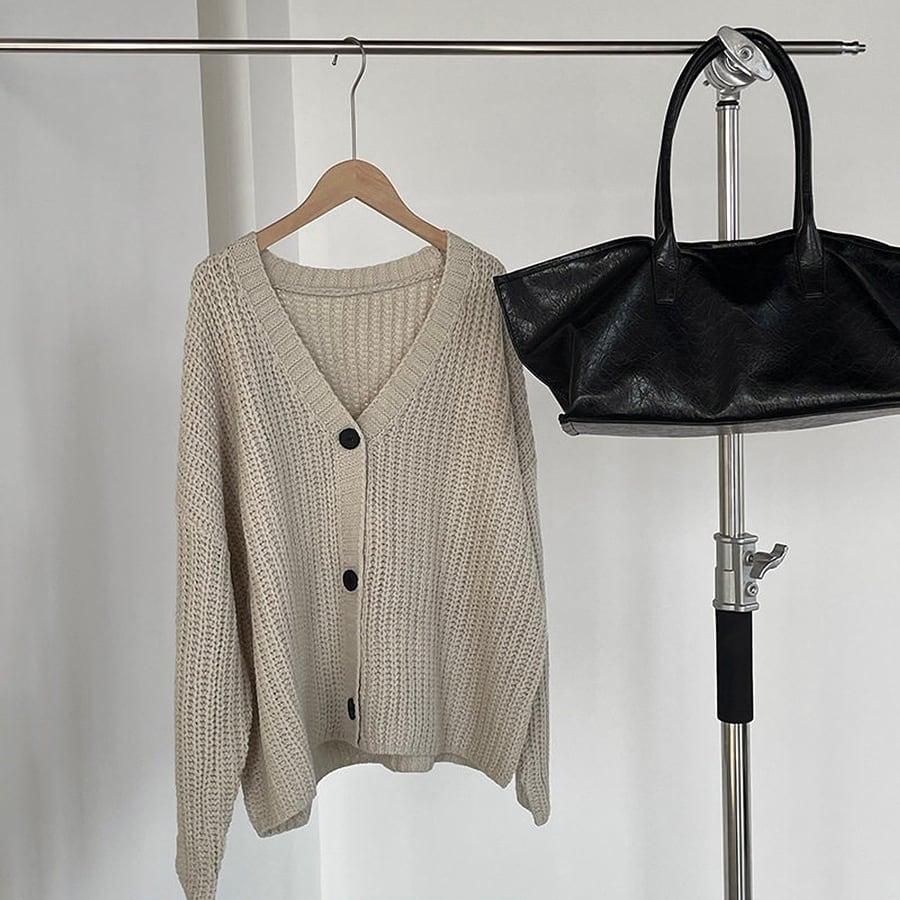 ゆったりとしたシルエットでリラックスして着られるVネックカーディガン。深めのVラインが抜け感をつくり、シンプルながら表情のあるデザインに仕上がっています。程よい丈感で、羽織としてもトップスとしても活躍。3色展開で、日常のコーディネートに自然と馴染む万能アイテムです。