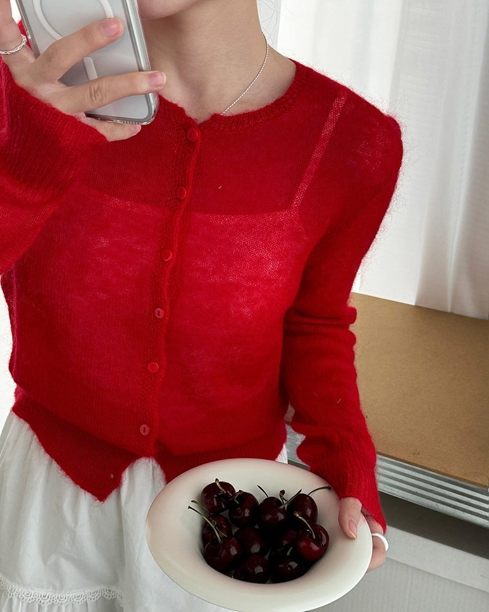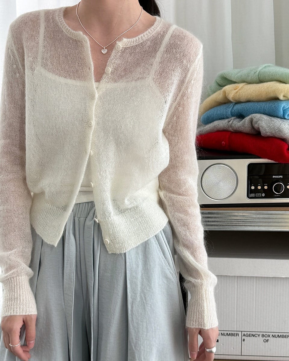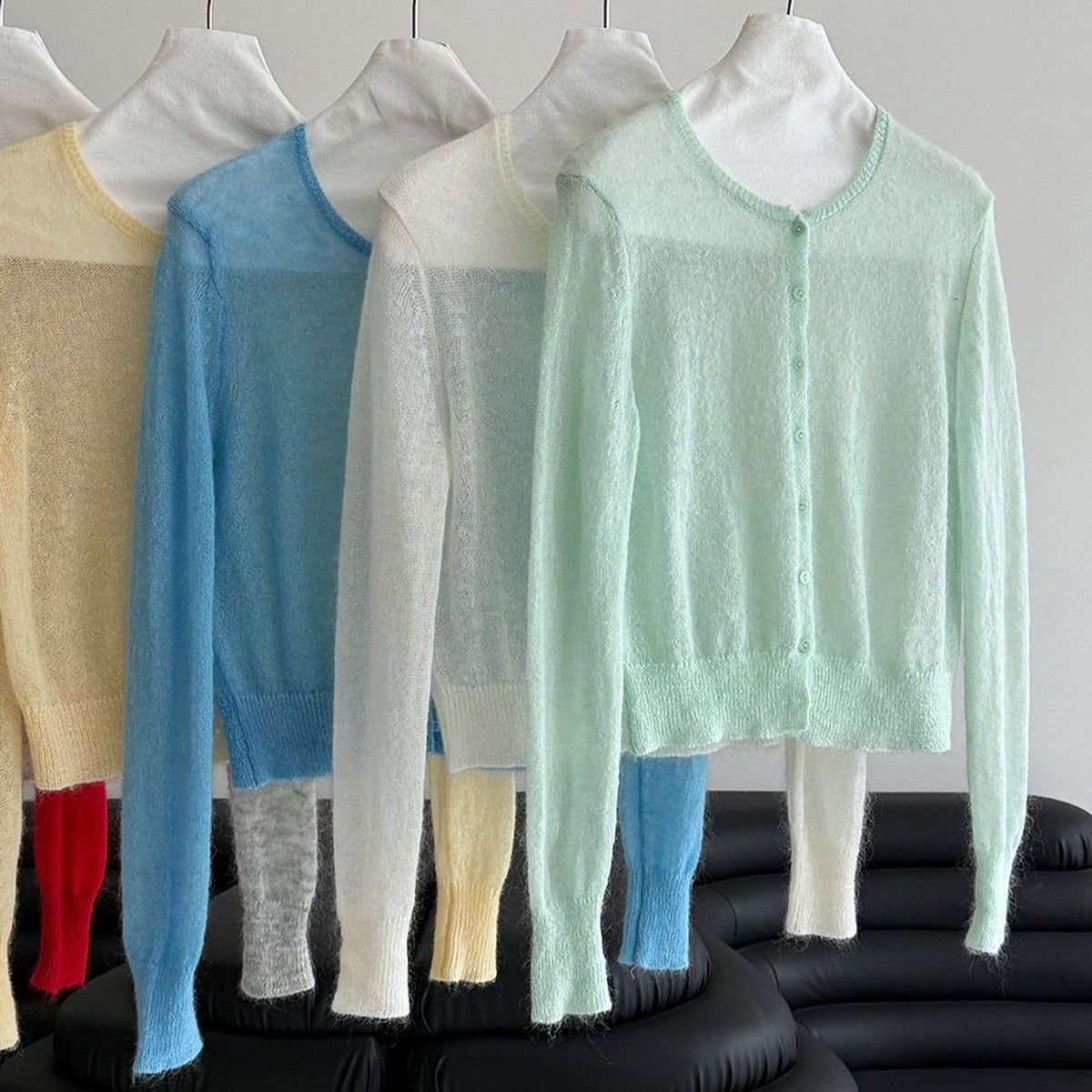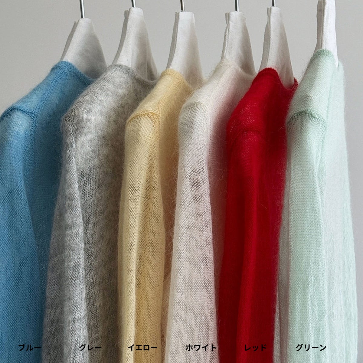 ふんわりとしたモヘア風の質感と、程よいシアー感が特徴のニットカーディガン。ショート丈でコンパクトにまとまり、レイヤードスタイルにも取り入れやすいデザインです。主張しすぎないシンプルさで、カジュアルにもきれいめにも対応。色違いで揃えたくなる6色展開も魅力です。