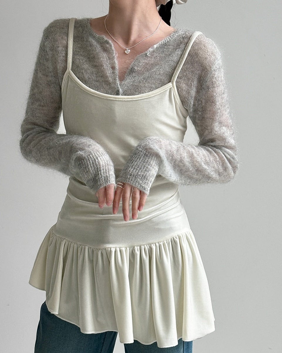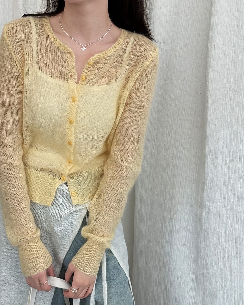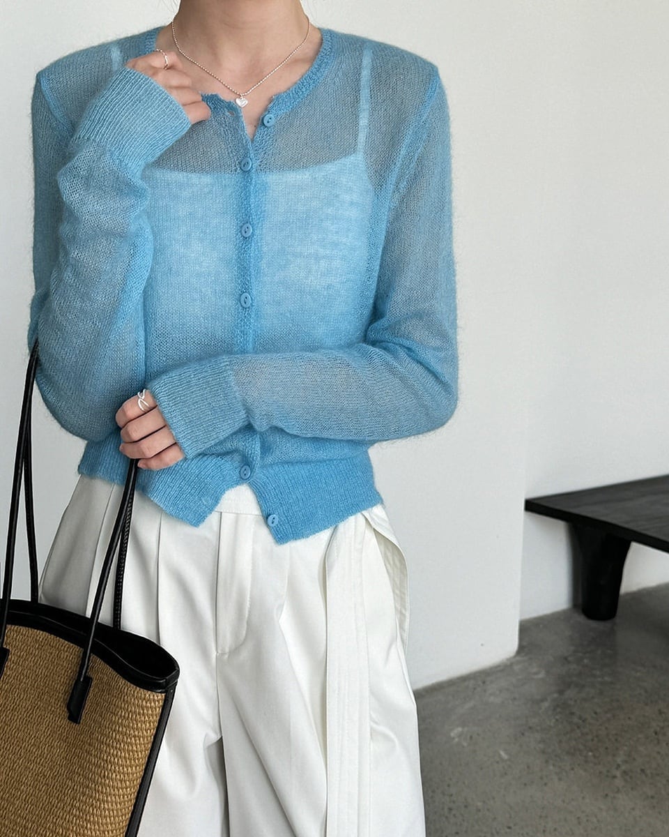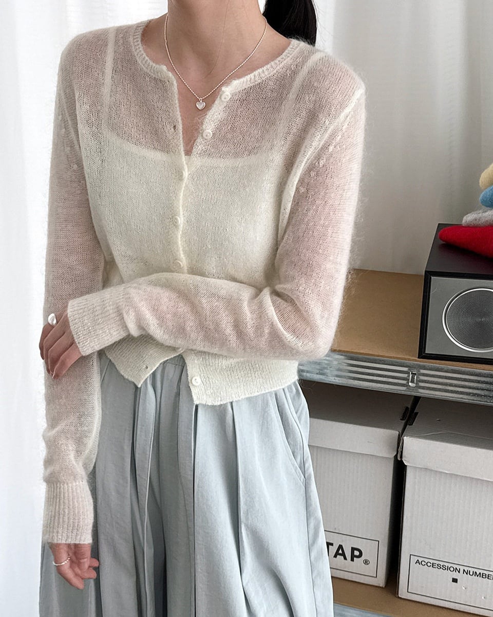 ふんわりとしたモヘア風の質感と、程よいシアー感が特徴のニットカーディガン。ショート丈でコンパクトにまとまり、レイヤードスタイルにも取り入れやすいデザインです。主張しすぎないシンプルさで、カジュアルにもきれいめにも対応。色違いで揃えたくなる6色展開も魅力です。