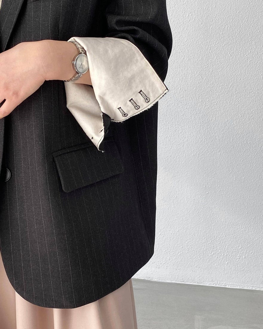 ダークグレーのストライプ柄が落ち着いた印象のオーバージャケット。大きめでゆったりとしたサイズ感が、かっちりしすぎない程よい抜け感を演出します。テーラードデザインで上品さを残しつつ、袖を折り返すと覗く白い生地がさりげないアクセントに。羽織るだけでコーデ全体を引き締めてくれる一着です。