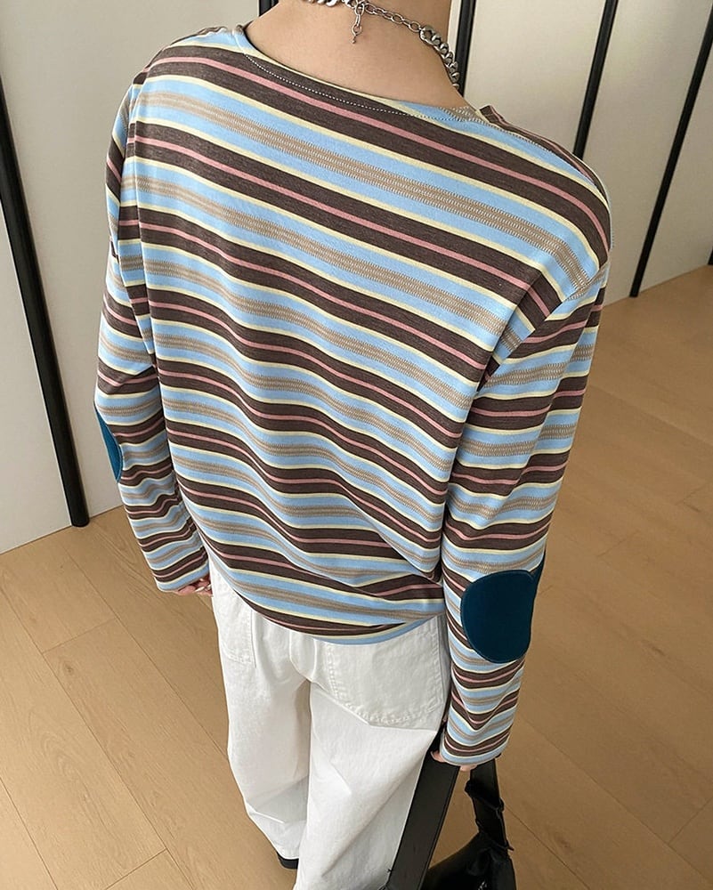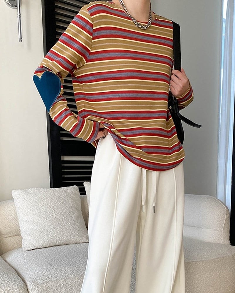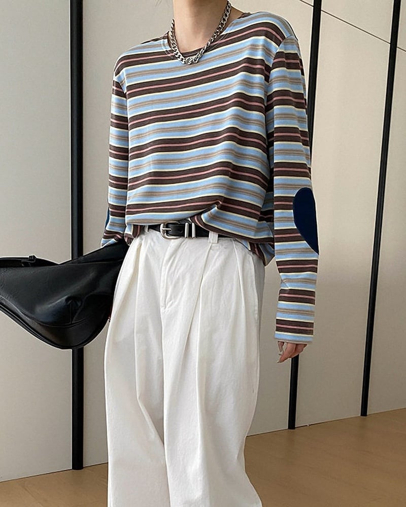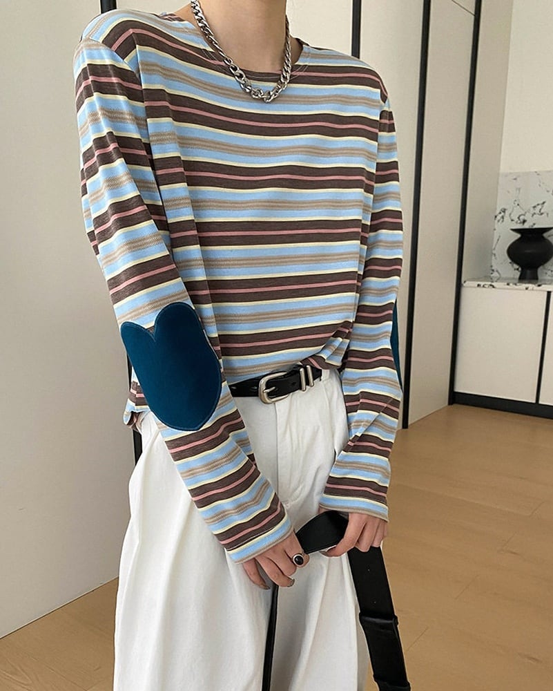 ベーシックなボーダー柄に、肘のハートアップリケを組み合わせたデザインカットソー。ほどよくラフなシルエットで着やすく、シンプルながら個性が光る一枚に仕上げました。2色展開で、スタイルに合わせて選べるのも魅力。普段使いにぴったりのカジュアルトップスです。