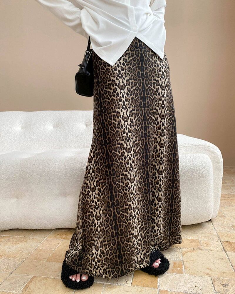 存在感のあるレオパード柄が目を引くロングスカート。長めの丈感が上品さを保ちつつ、コーディネートを一気に華やかな印象へと導きます。シンプルなトップスと合わせるだけでスタイルが完成する、まさに主役級の一枚。日常使いからお出かけシーンまで、着こなしを格上げしてくれるアイテムです。