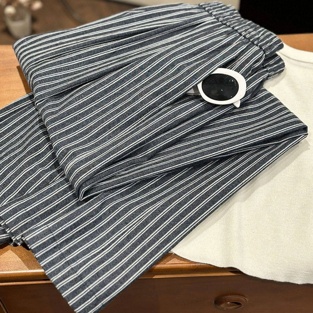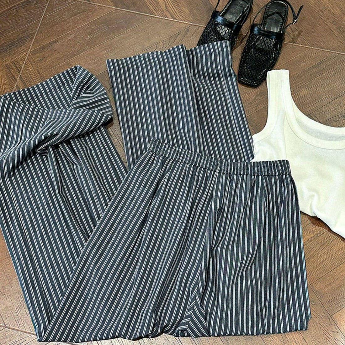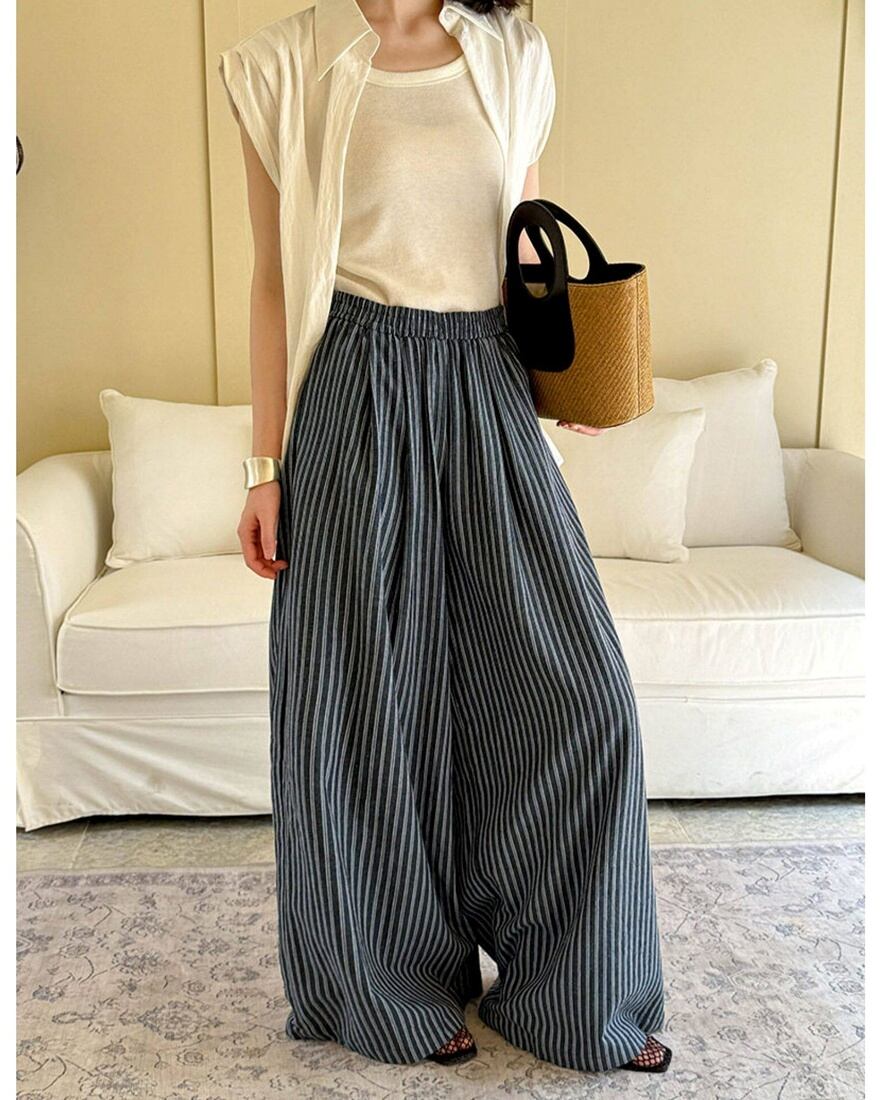 リラックス感のあるウエストゴム仕様のワイドパンツ。ゆったりとしたシルエットで体のラインを拾いにくく、ストレスフリーな着用感が魅力です。細めのストライプ柄が縦のラインを強調し、自然なスタイルアップ効果も。落ち着いたカラーリングで、デイリーに取り入れやすいアイテムです。