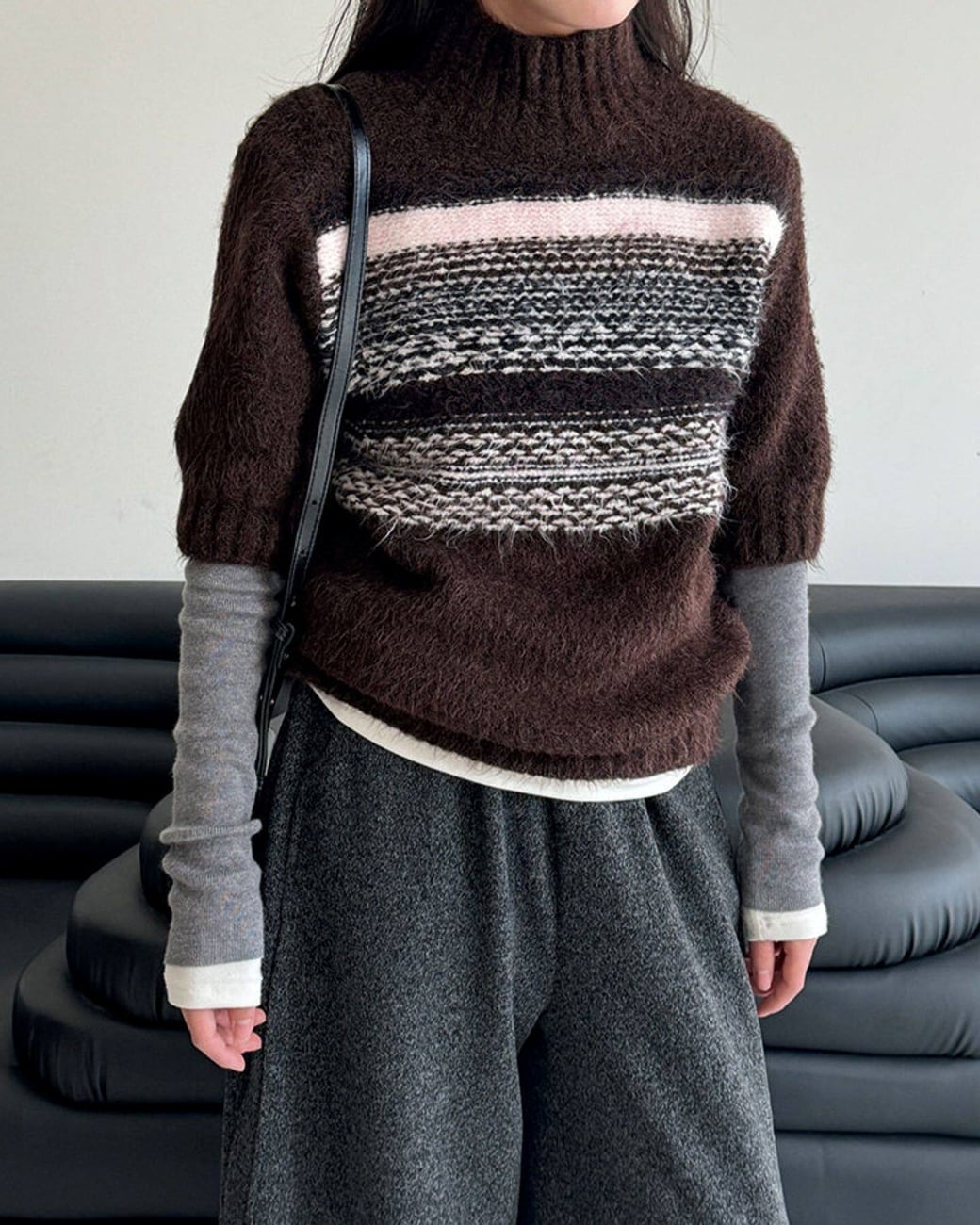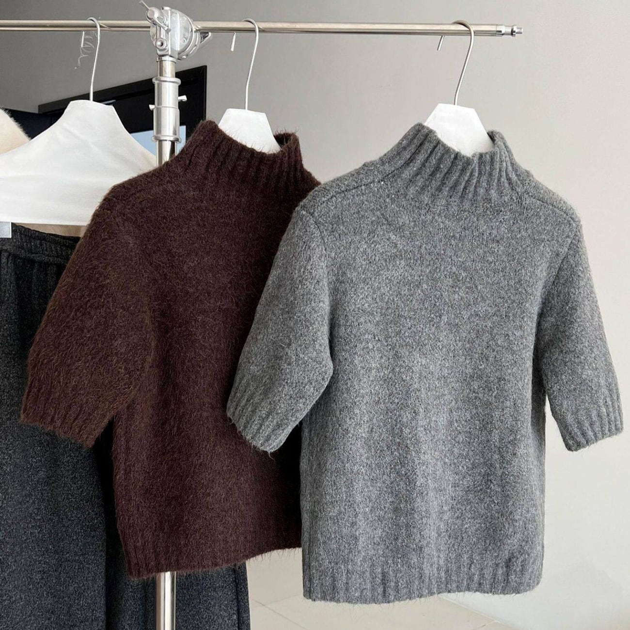 やわらかなニット素材で仕立てた、ハイネックのショートスリーブトップス。フロントにあしらったニュアンスボーダー柄が、さりげないアクセントを添えます。カラーは落ち着きのあるグレーとブラウンの2色展開。季節の変わり目にちょうどよい程よい厚みで、一枚でもレイヤードでも活躍する着回し力の高いアイテムです。