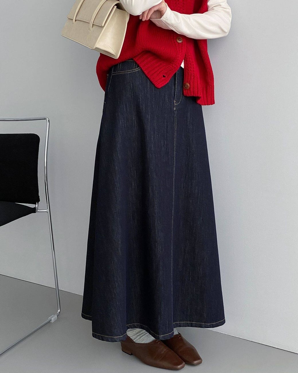 深みのある紺色系デニムを使用したロングスカート。広がりすぎない優しいフレアシルエットが女性らしさを引き立てつつ、シンプルなデザインで着回し力も抜群です。カジュアルなトップスと合わせるだけでこなれた印象に。季節を問わず活躍する一着です。