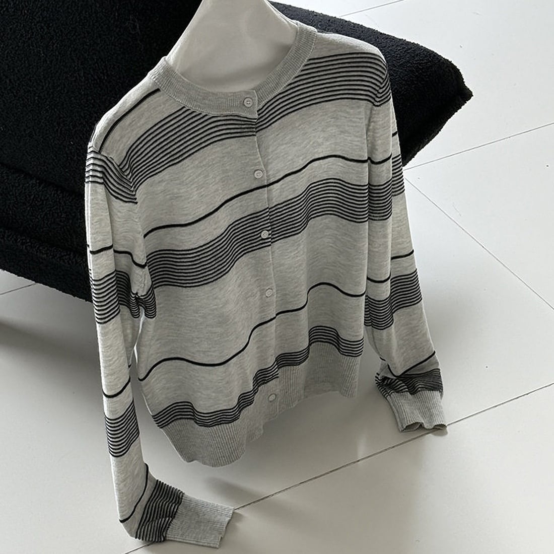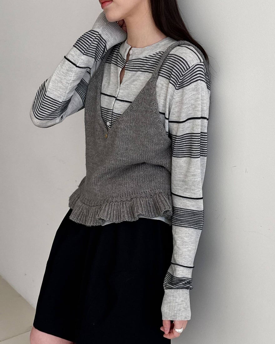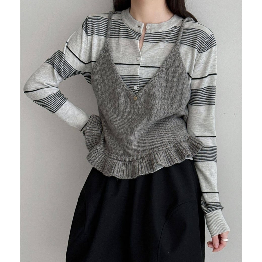 ニュアンス感のあるボーダー柄が魅力の一枚。細めのピッチで仕上げることで、カジュアルになりすぎずスタイリッシュな印象に。薄手の軽やかな生地感で、季節の変わり目にさっと羽織れるのも嬉しいポイントです。カラーはイエローとグレーをご用意。コーデの差し色にも活躍します。