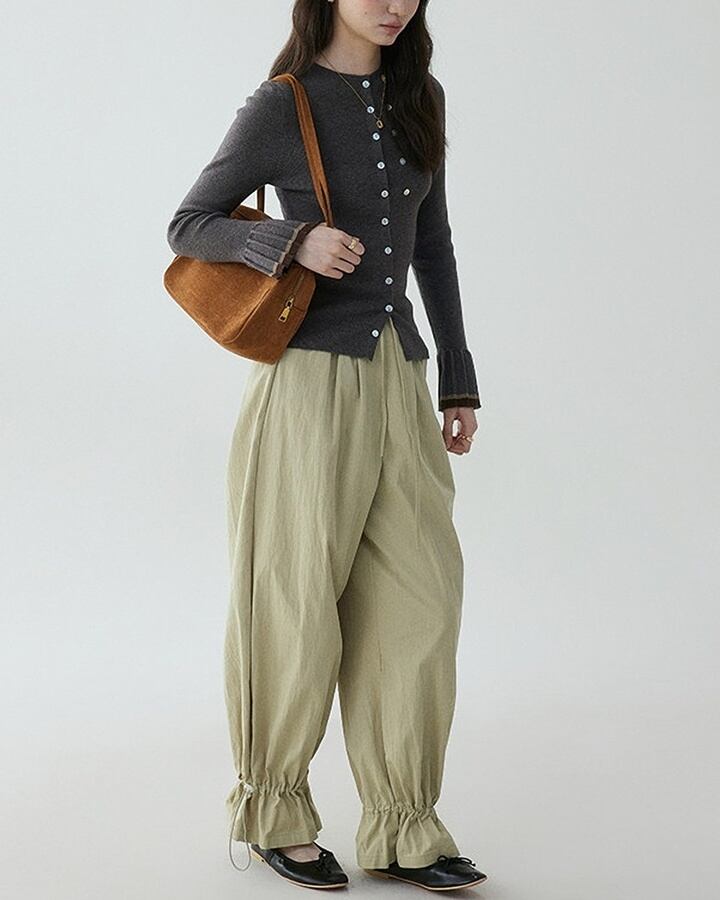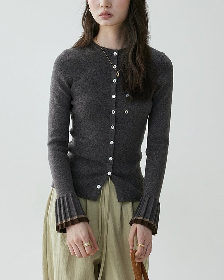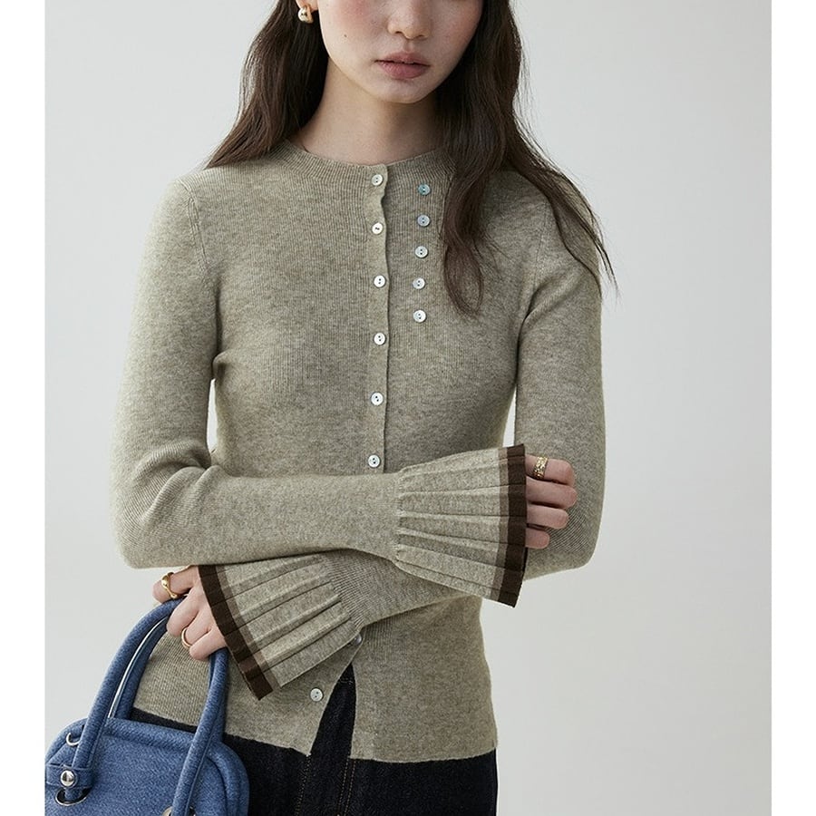 スリムなシルエットが女性らしさを引き立てるカーディガン。袖口にはプリーツデザインを施し、バイカラーで仕上げたアクセントが魅力です。レディライクな印象ながら、さりげなくコーデのポイントになり、シンプルな着こなしに華やかさをプラスします。