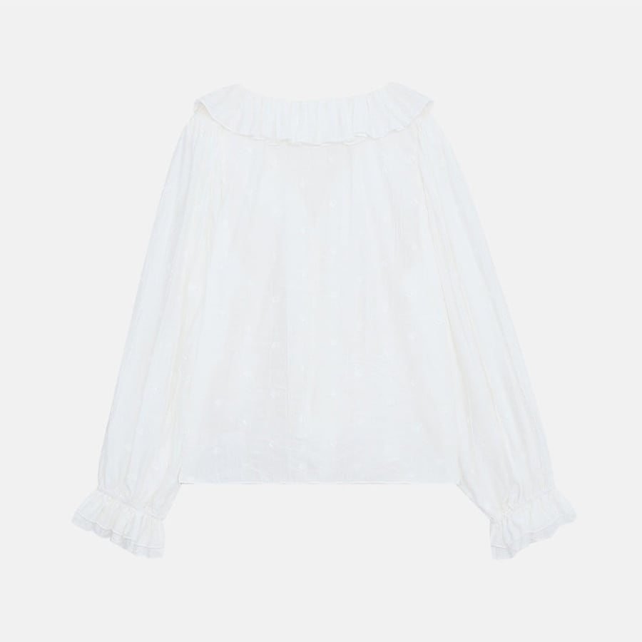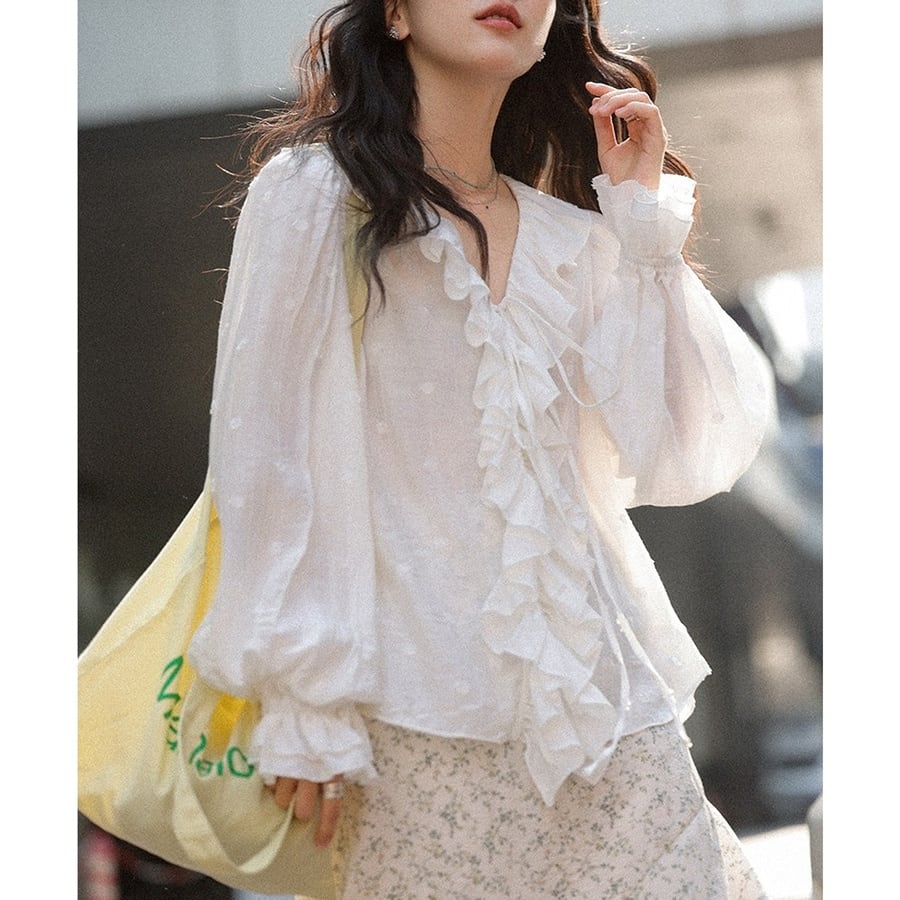 やわらかな素材感が魅力の、レディライクなホワイトブラウス。襟元はすっきりとしたVネックで顔まわりをシャープに見せ、女性らしい印象を引き立てます。フリルデザインがほどよい華やかさをプラスし、シンプルながら存在感のある一枚。ふわっと軽やかな着心地で、デイリーからお出かけまで幅広く活躍します。