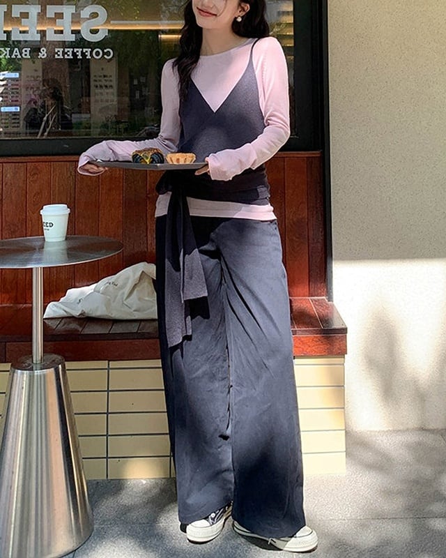 スリムな長袖カットソーにノースリーブを重ねた、レイヤードデザインが特徴のカットソー。1枚でコーディネートに奥行きが生まれ、スタイリングのアクセントとして活躍します。すっきりとしたシルエットで、ジャケットやカーディガンのインナーとしても使いやすいアイテム。カラーはグレー/ダークグレーとピンク/ネイビーの2色展開で、雰囲気の異なるスタイルを楽しめます。