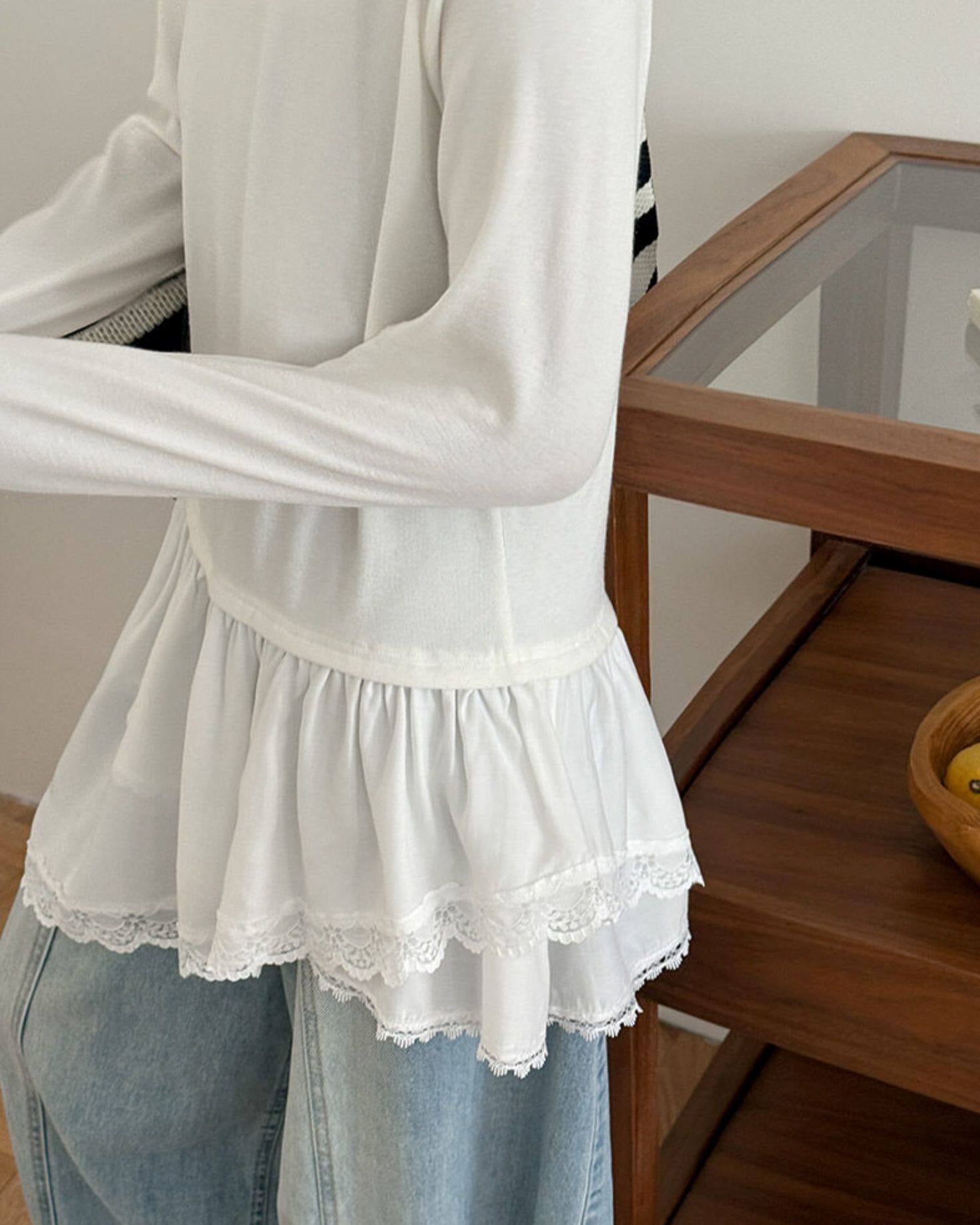 シンプルなカットソーをベースに、裾はフレアシルエットにレースをあしらったデザイン。動きのある軽やかなシルエットとレースの繊細な表情が、女性らしい印象をプラスします。パンツと合わせるとヒップが隠れる丈感で、バランスよく着こなせるのもポイント。レイヤードスタイルにも取り入れやすく、コーディネートのさりげないアクセントになる一枚です。