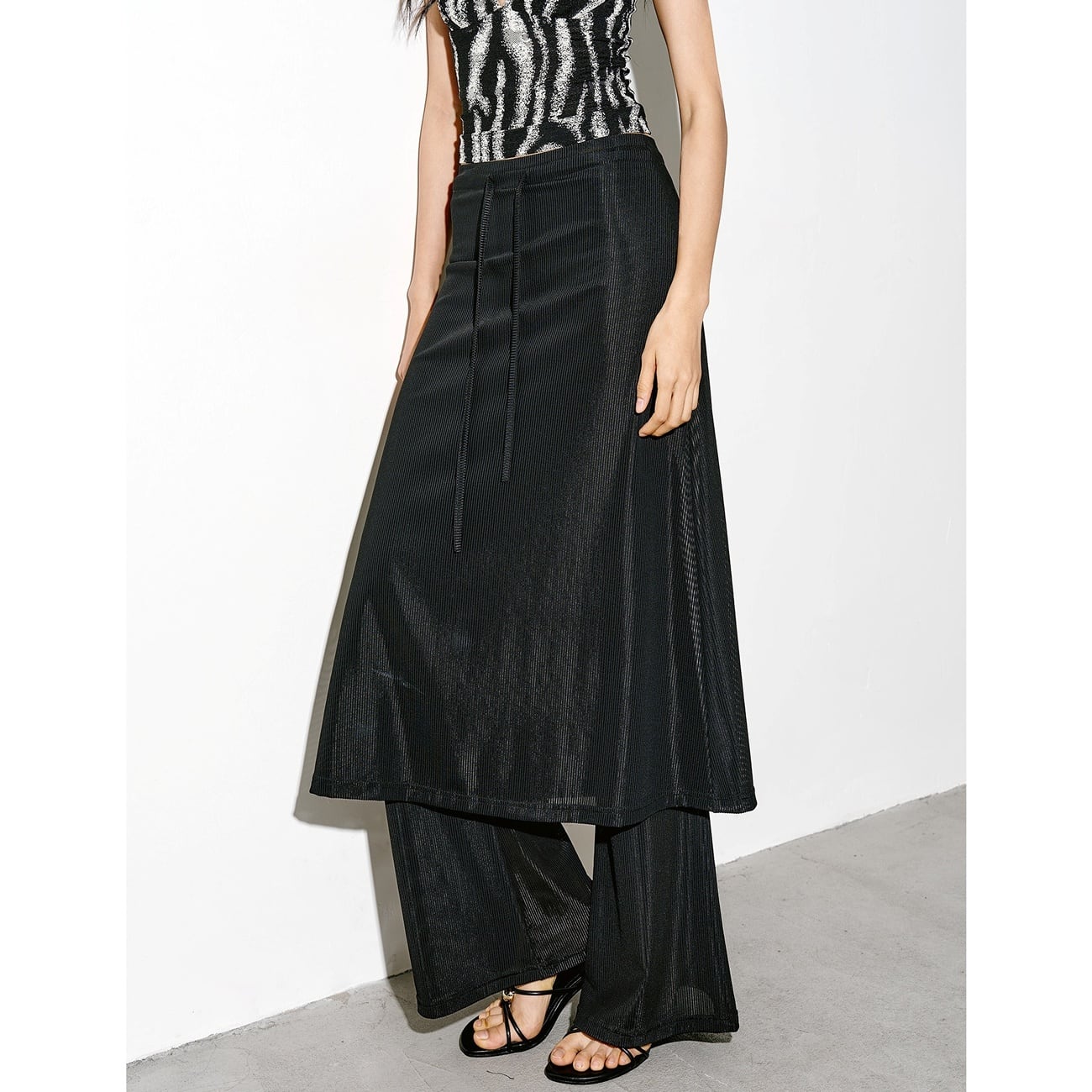 軽やかなシアー素材が涼しげな印象を与えるレイヤードパンツ。長めのスカートを重ねたデザインで、動くたびにふんわりと揺れるシルエットが魅力です。内側のパンツはフレア風に広がり、脚をきれいに見せながら抜け感も演出。ブラックカラーで甘さを抑えた、大人のための一着。