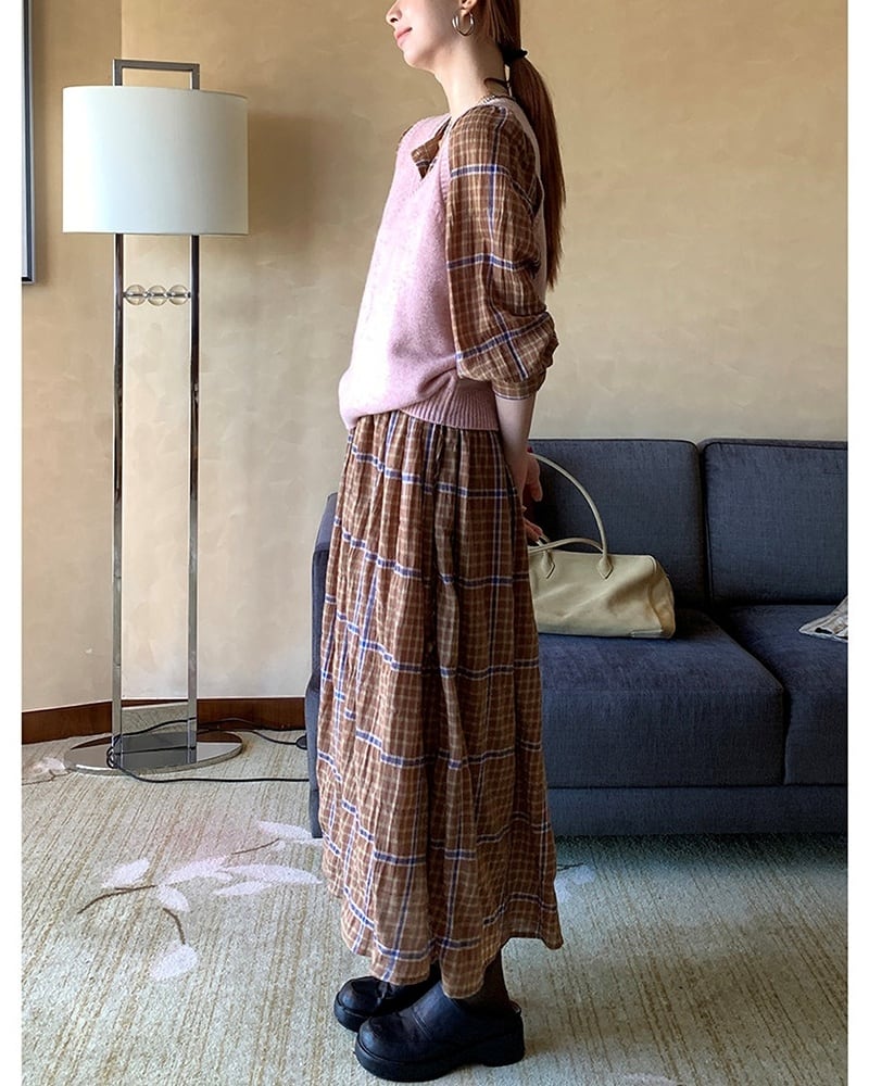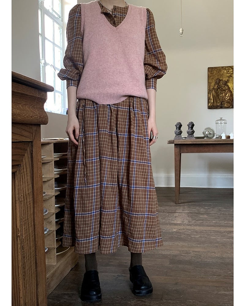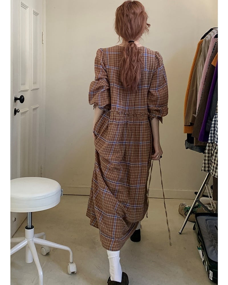 落ち着いたブラウン系チェックに、フリルとギャザーで表情を加えたロングワンピース。レトロな雰囲気を感じさせながら、日常使いしやすいデザインに仕上げています。動くたびにやわらかく揺れるシルエットが魅力で、コーディネートの主役として活躍する一枚です。