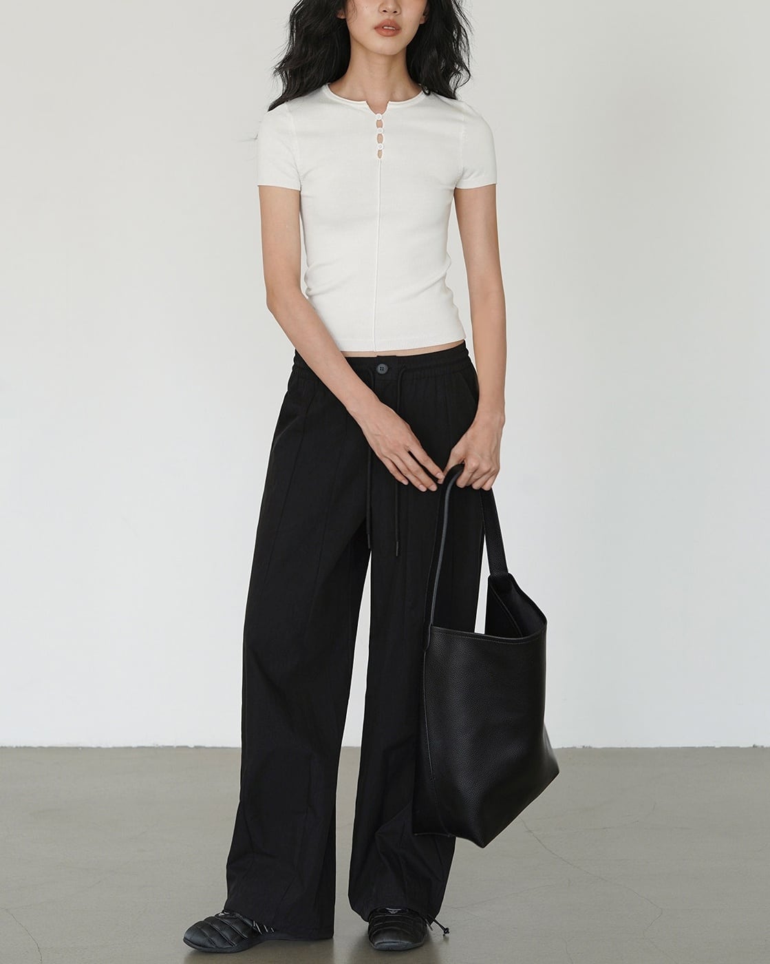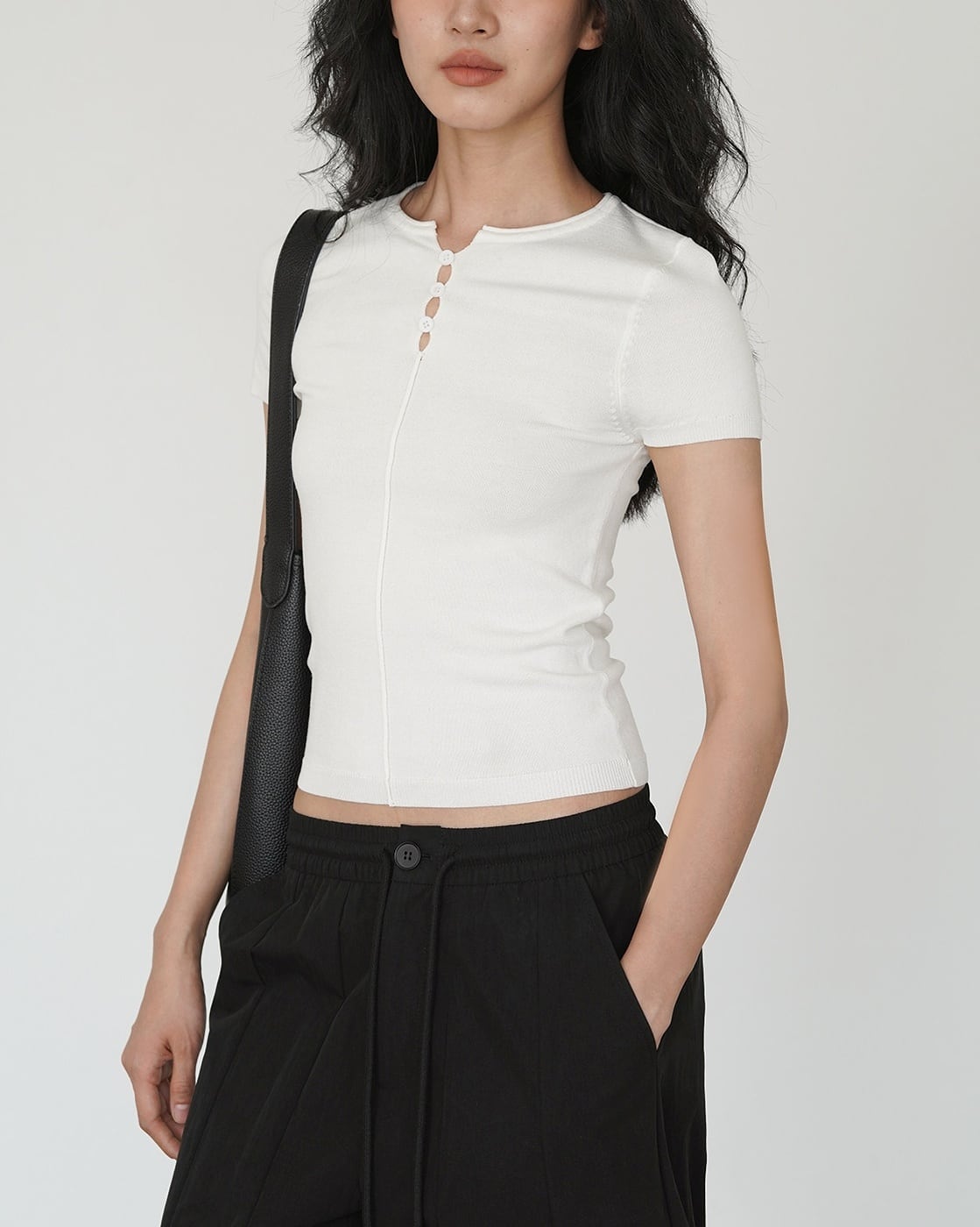 タイトなシルエットで女性らしいラインを引き立てるスリムカットソー。フロントのボタンデザインがさりげないアクセントとなり、シンプルながらもこなれた印象に仕上げます。無駄のないミニマルなデザインで、デイリーからきれいめスタイルまで幅広く活躍。白と黒の2色展開で着回し力も抜群です。