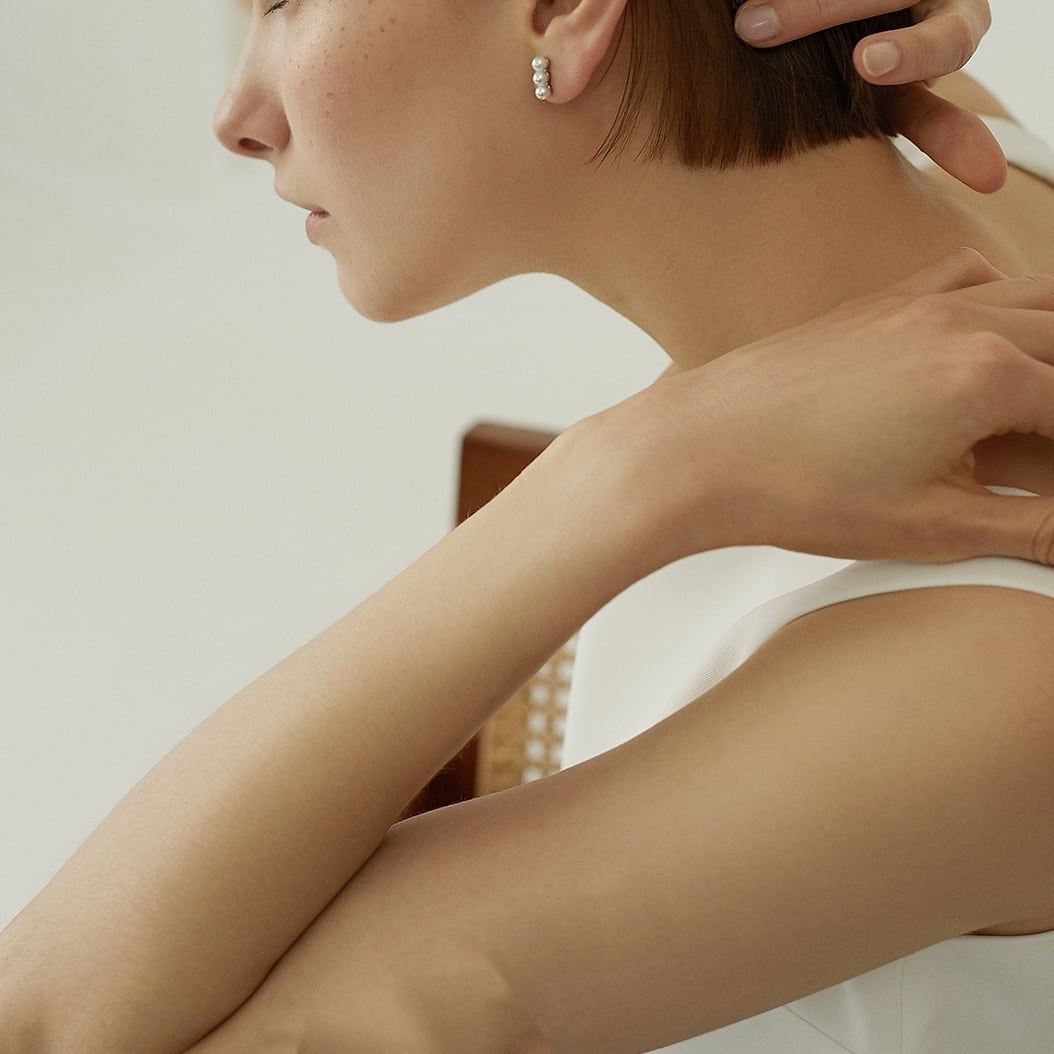 さり気ないプチパールが華やかさを演出。パールの女性らしい印象と縦のラインでシャープさもプラス。耳にフィットするスタッドタイプでマスクをしていても安心です。