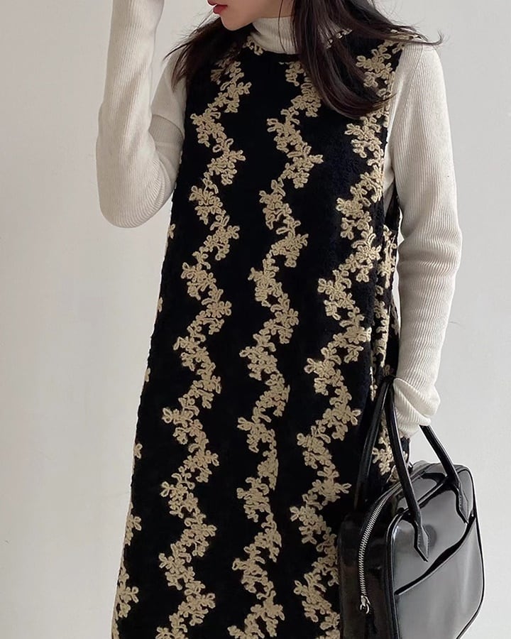 ジャガードデザインで一枚で様になり、シックな中に今っぽい抜け感を叶える◎ハイネックニットとのレイヤードも楽しめる一着。